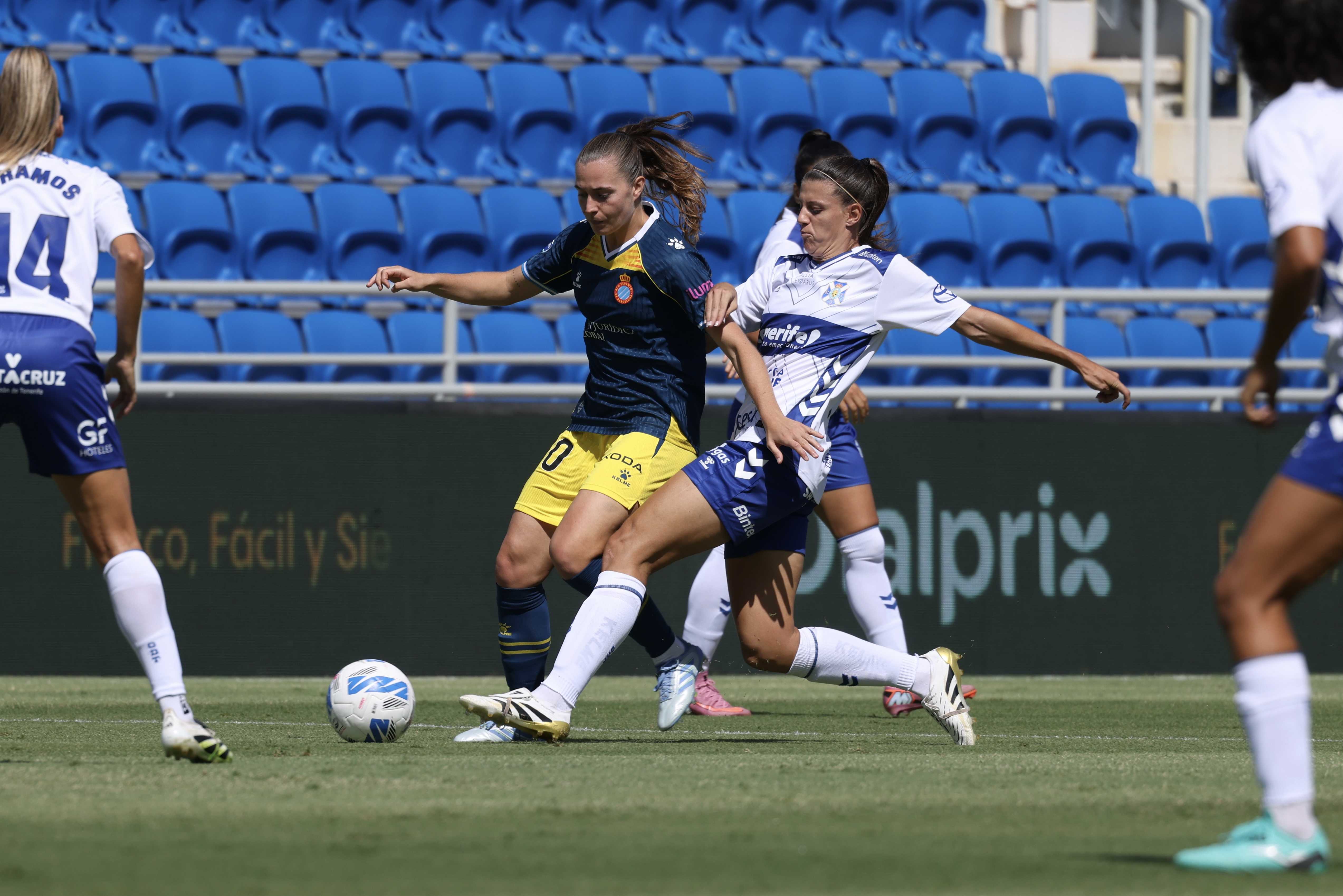El partit va començar molt equilibrat, ambdós equips es mostraven sòlids i no permetien arribar a les àrees. El moment més delicat de la primera part va arribar al quart d’hora. Mar Torras va patir un fort cop al cap després d’un xoc amb una rival. La migcampista va haver de rebre assistència mèdica immediata i, després de ser atesa, li van col·locar fins a quatre grapes per poder continuar. Durant aquells minuts en què les visitants van jugar en inferioritat, el Tenerife va intentar fer un pas endavant i va buscar amb insistència la porteria de Romy, tot i que sense aconseguir ocasions clares.