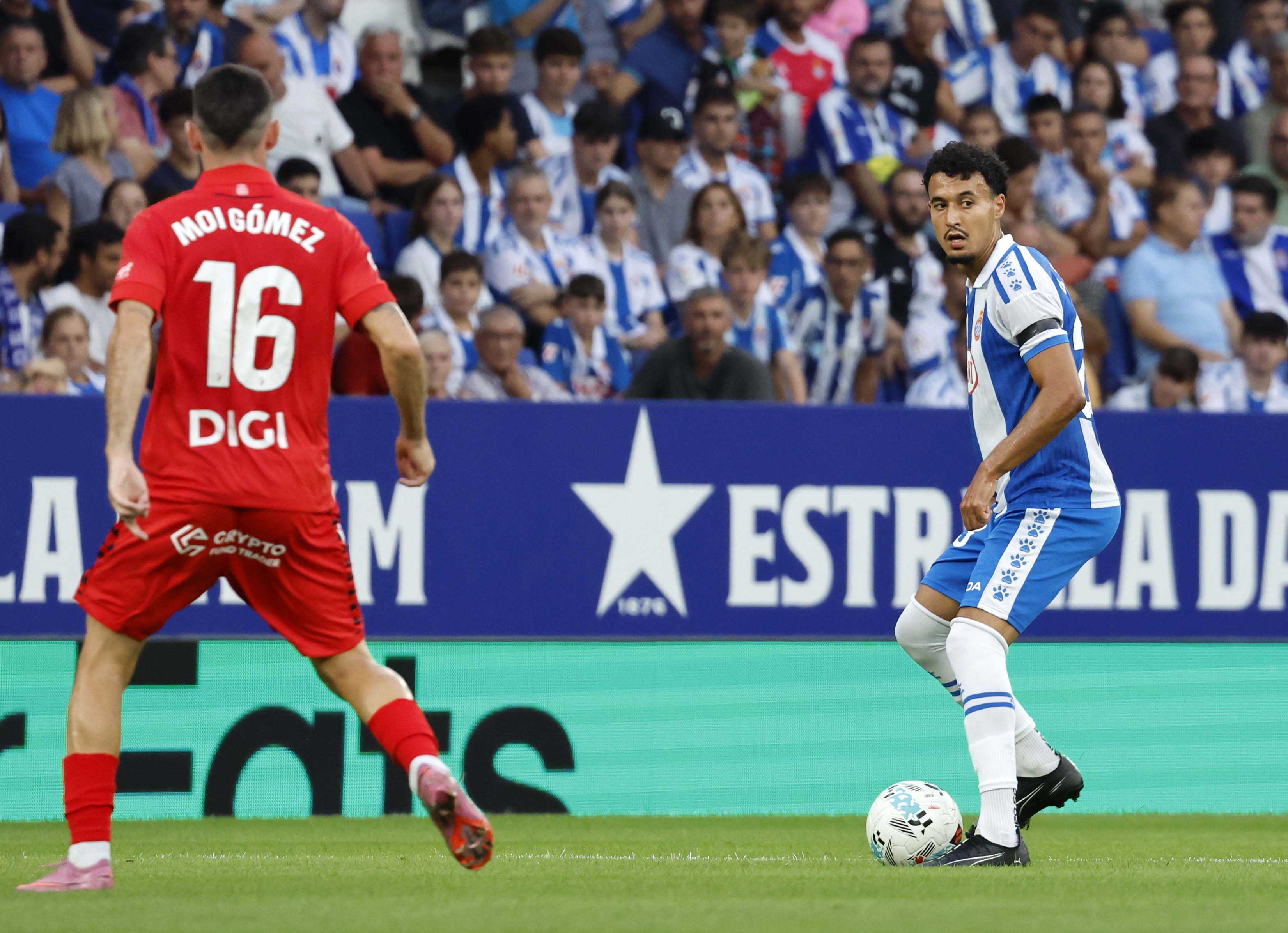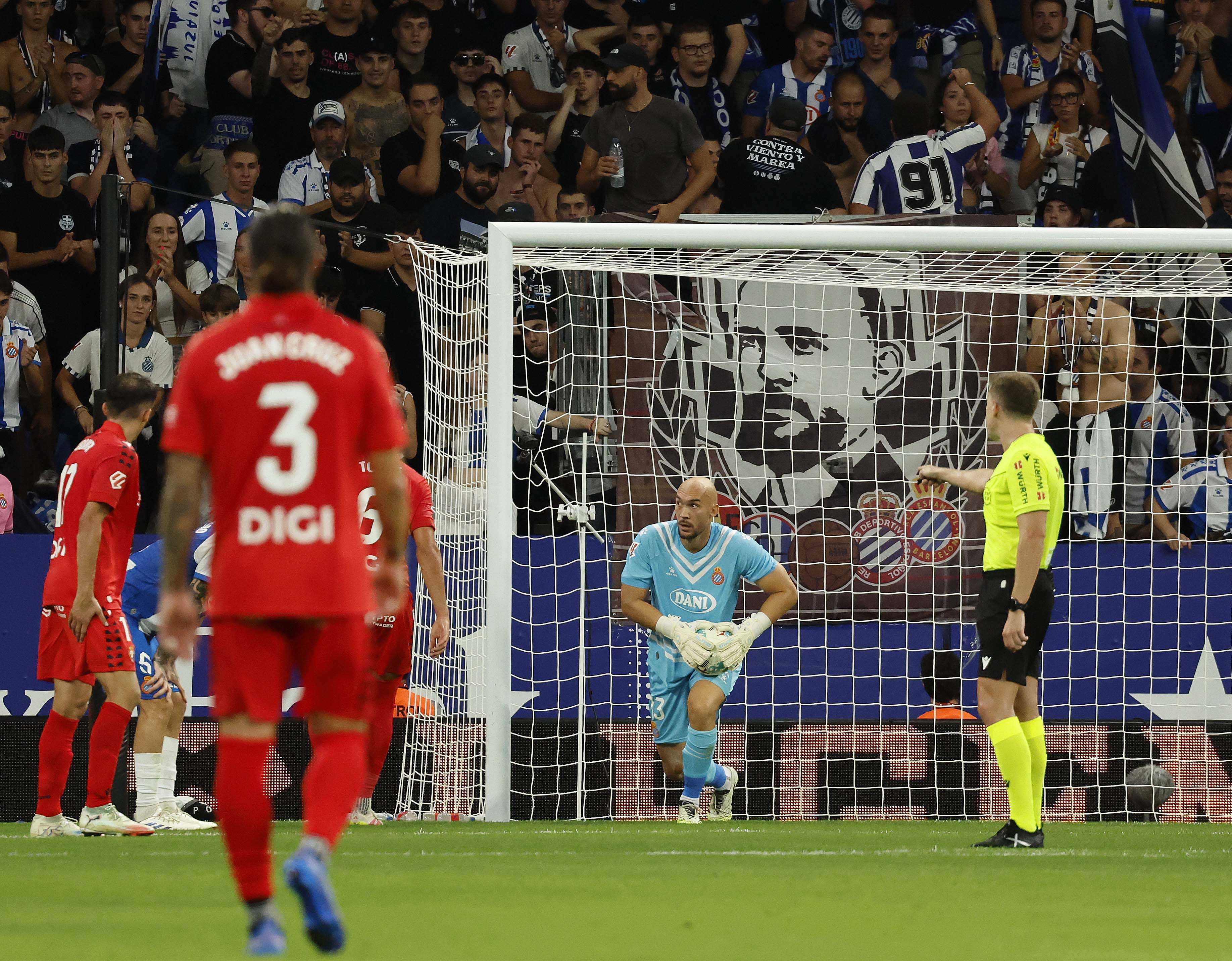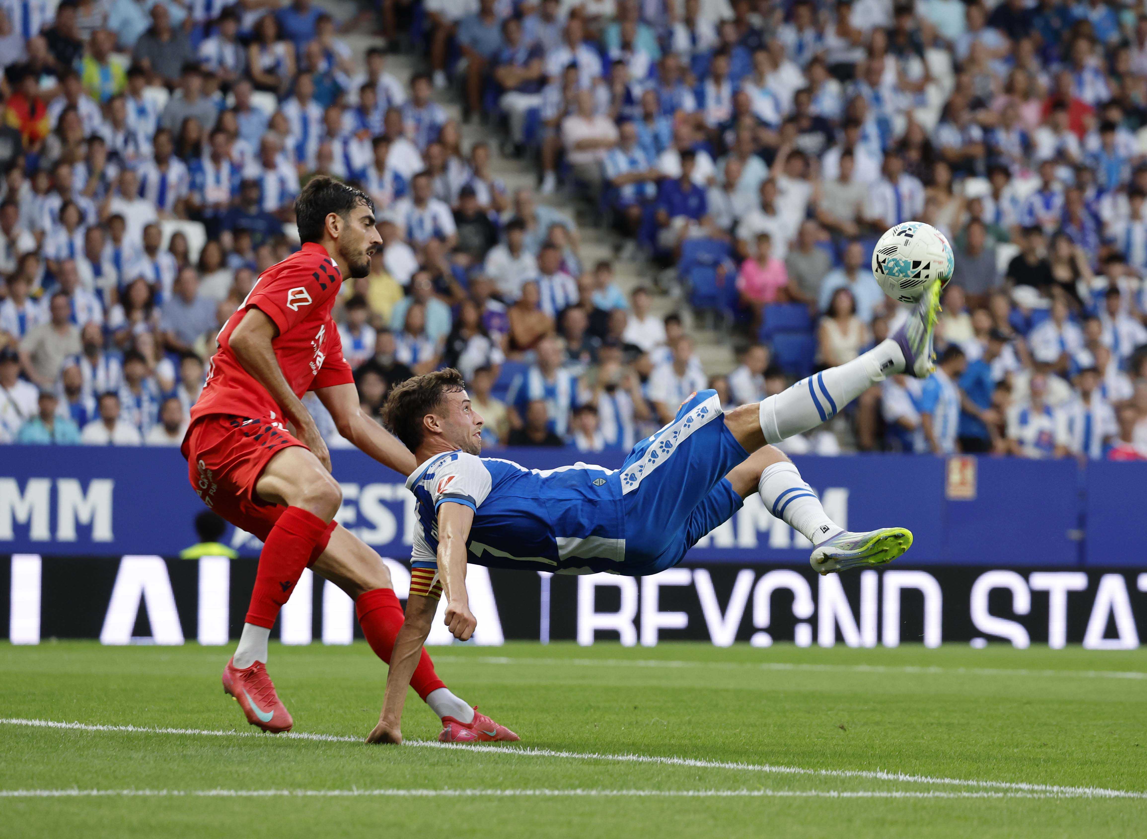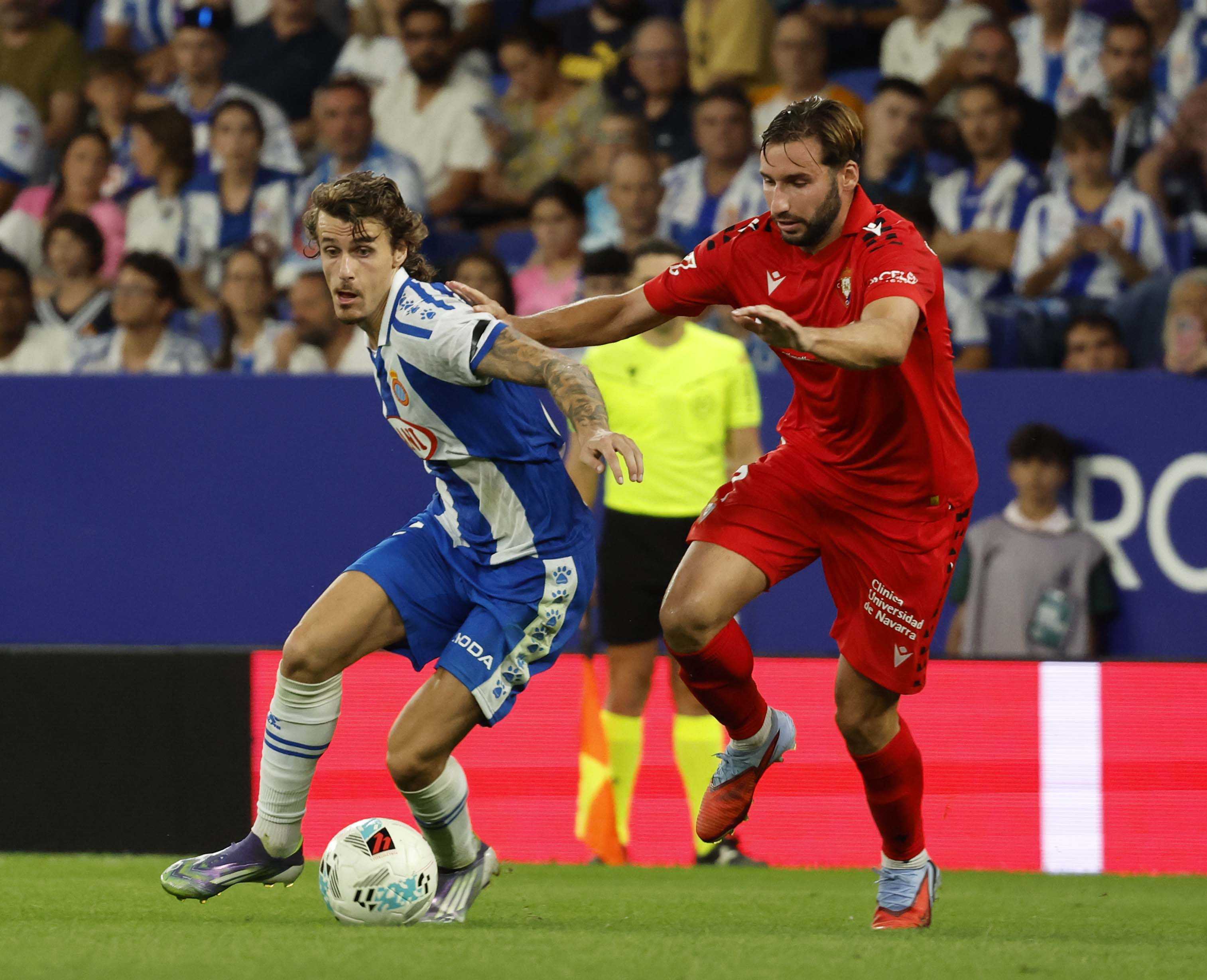 Manolo González va exigir als seus homes intensitat per igualar Osasuna tant en els duels com en la seva manera d’afrontar els partits. Els jugadors semblaven tenir molt clar el missatge i Kike García, que s’estrenava com a titular, va disposar d’una oportunitat claríssima després d’una bona passada de Pere Milla. L’Espanyol va continuar insistint, oferint molt bones sensacions des de l’inici. Kike es va faixar al límit i va generar bones opcions per als seus companys. L’atac perico va sorprendre un Osasuna que es va veure desbordat. Pere Milla, una altra vegada titular, ho va provar amb un xut llunyà que Sergio Herrera va refusar i, poc després, va ser Kike qui va perdonar el primer en una acció claríssima. Puado també va voler la seva quota de protagonisme i ho va provar amb un parell de rematades tan forçades com inofensives. El partit estava clarament dominat pels locals, fins que Osasuna va donar un gir de guió. En un dels pocs desajustos defensius de l’Espanyol, Budimir va caçar una pilota a la frontal que Dmitrović va refusar amb solvència. Aquella acció va desestabilitzar l’equip local, que va patir en un llançament de falta visitant i va respirar quan el pal va frustrar el gol de Moncayola.
