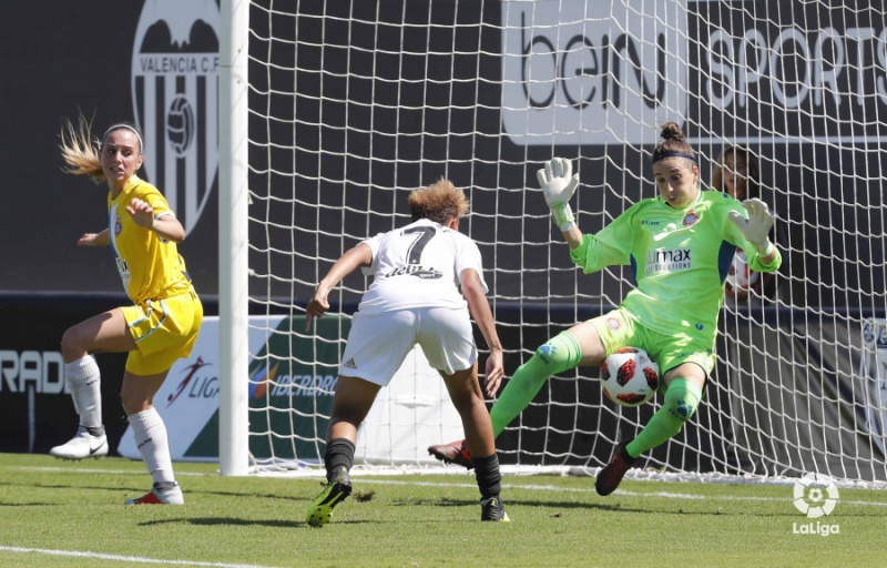 El partit no va poder començar pitjor pels interessos espanyolistes, en una de les primeres accions als quatre minuts, les valencianistes van recuperar a prop de l’àrea de Mariajo i Mari Paz no va perdonar amb una fuetada impossible d’aturar per a la portera espanyolista.