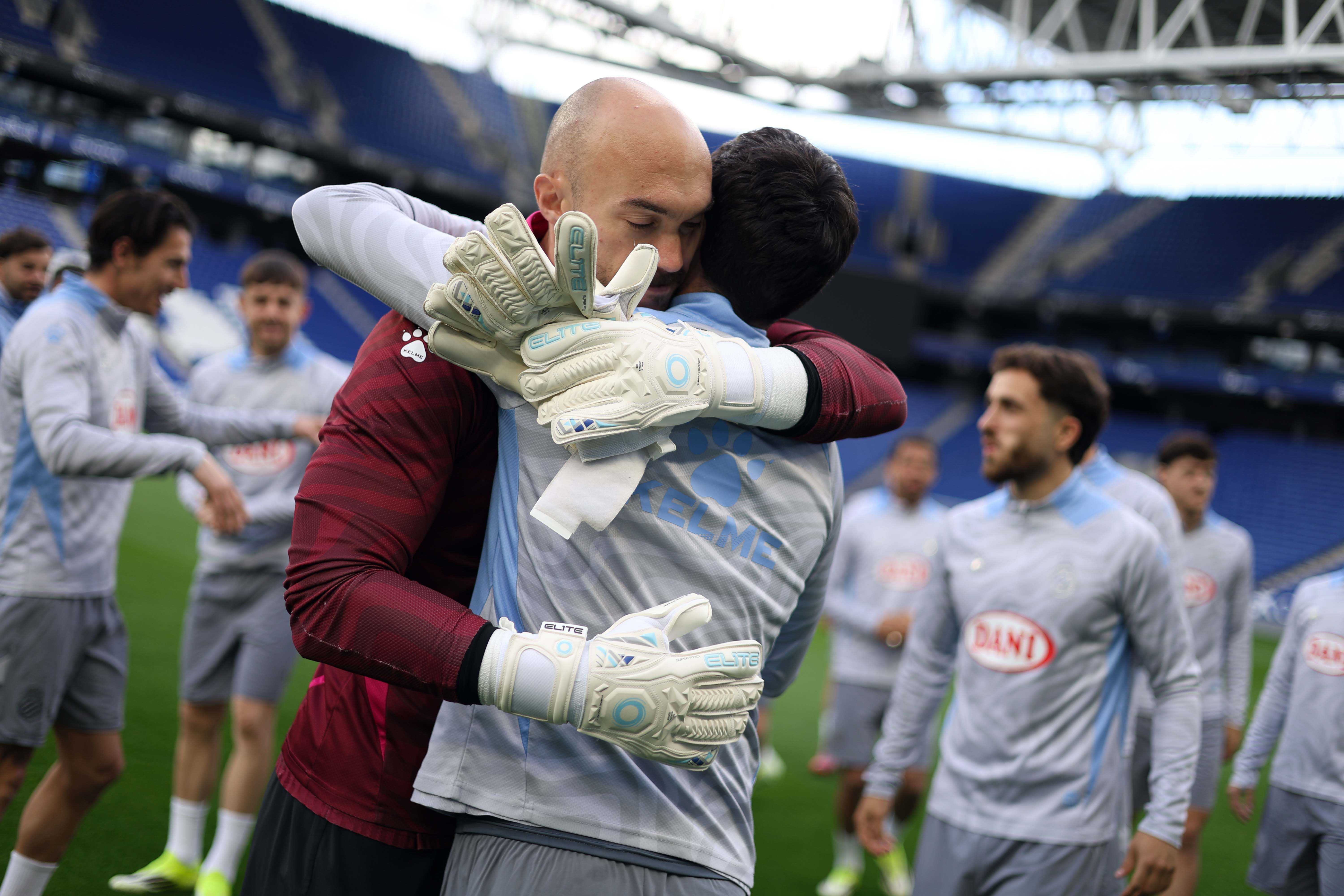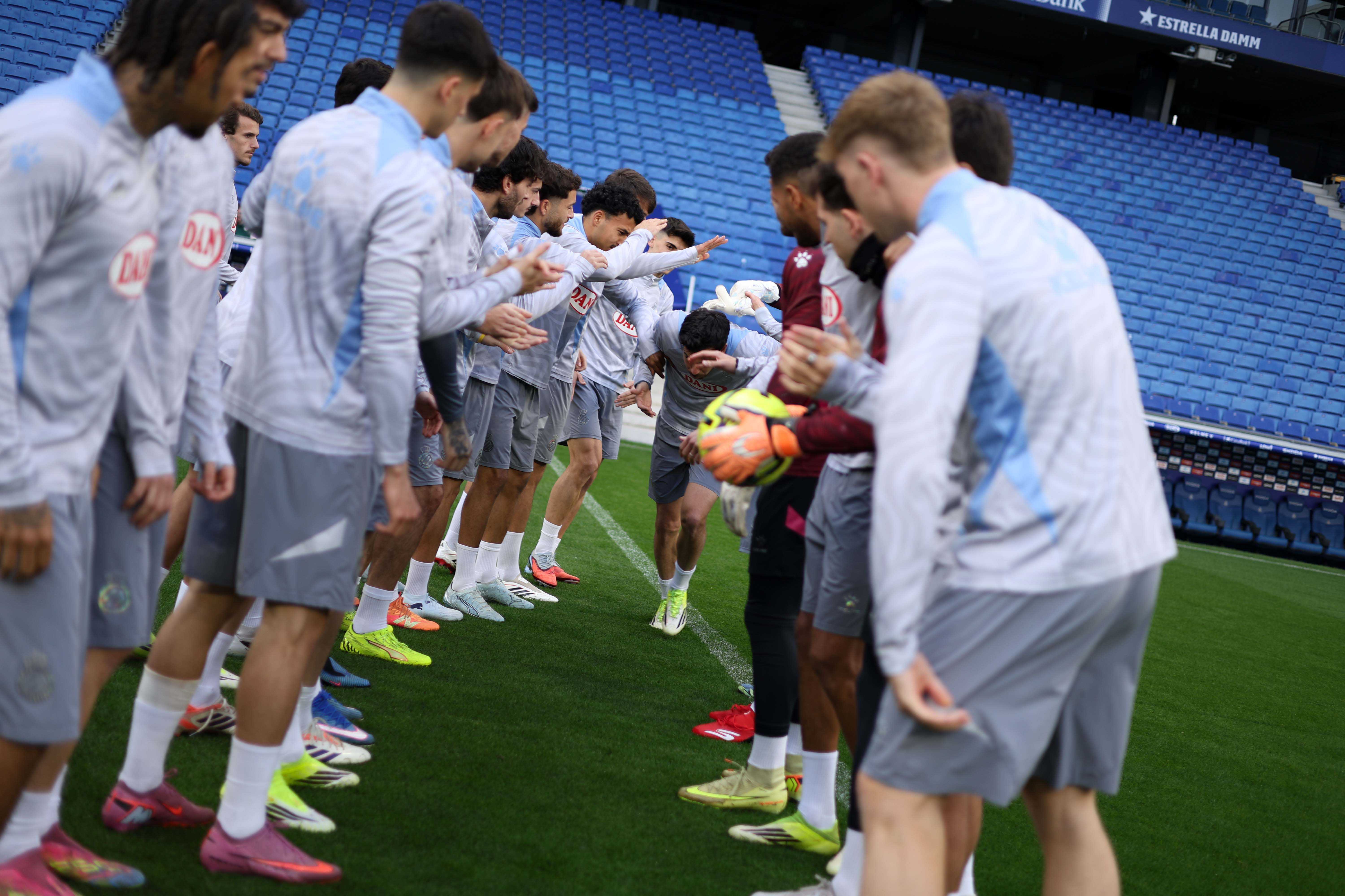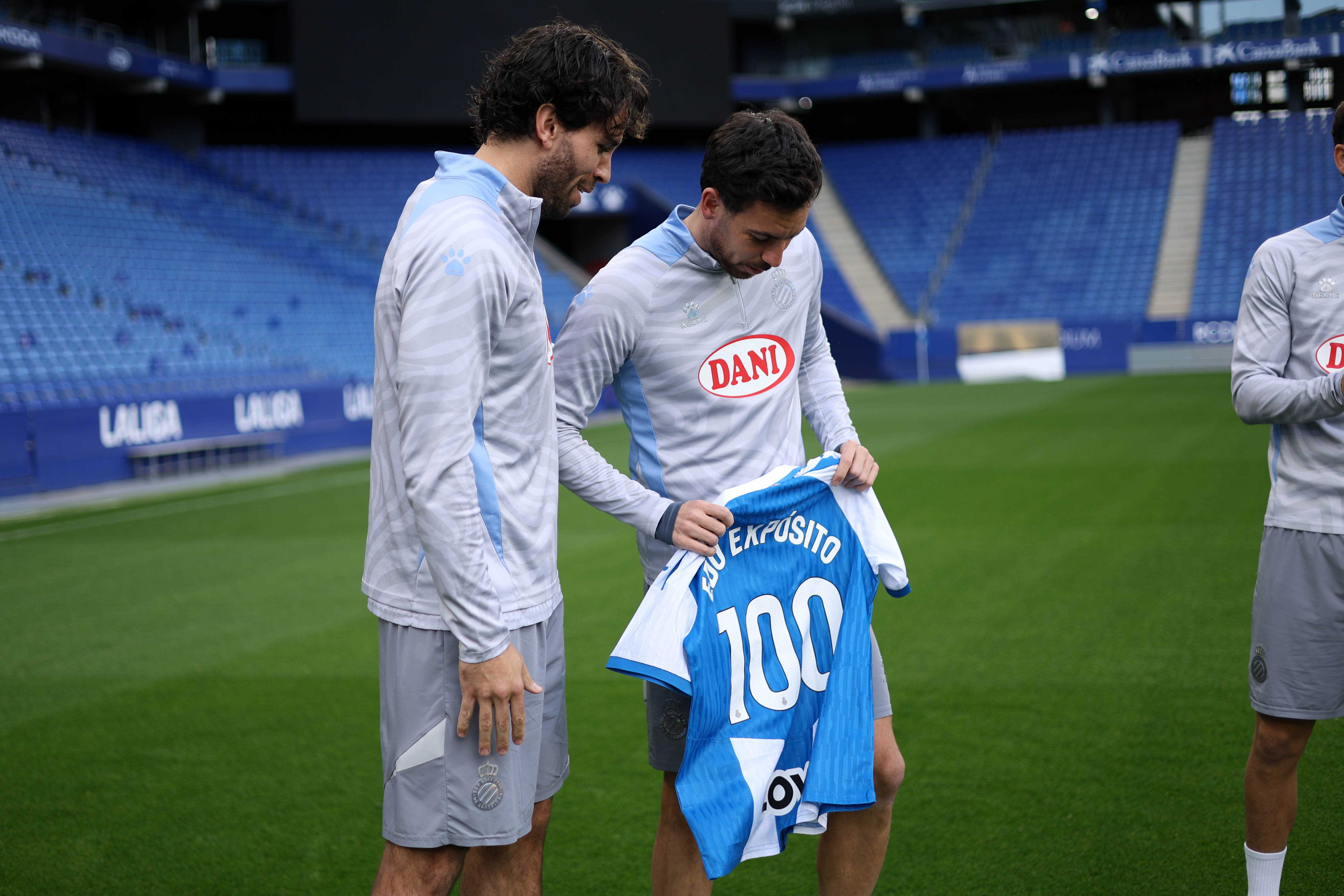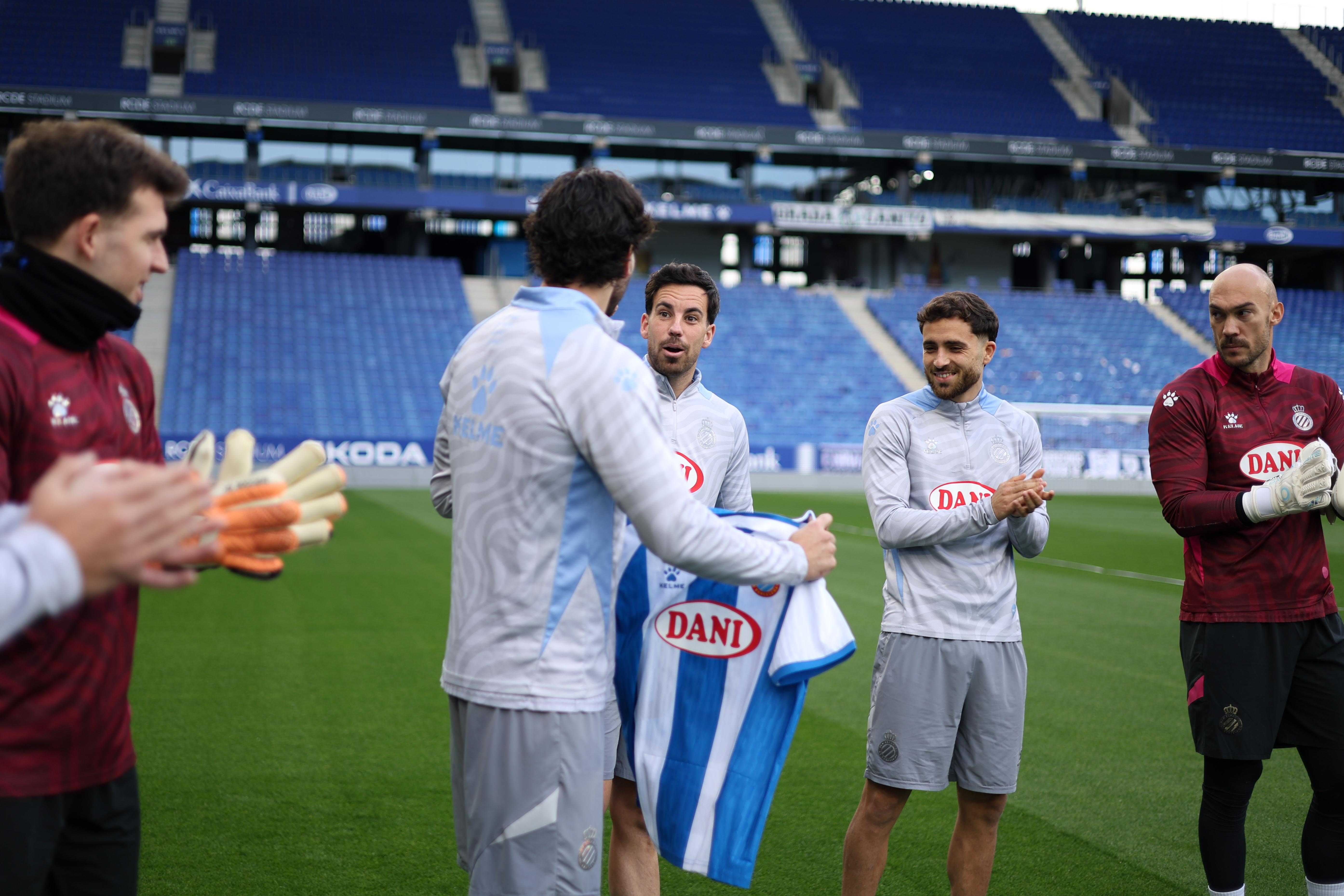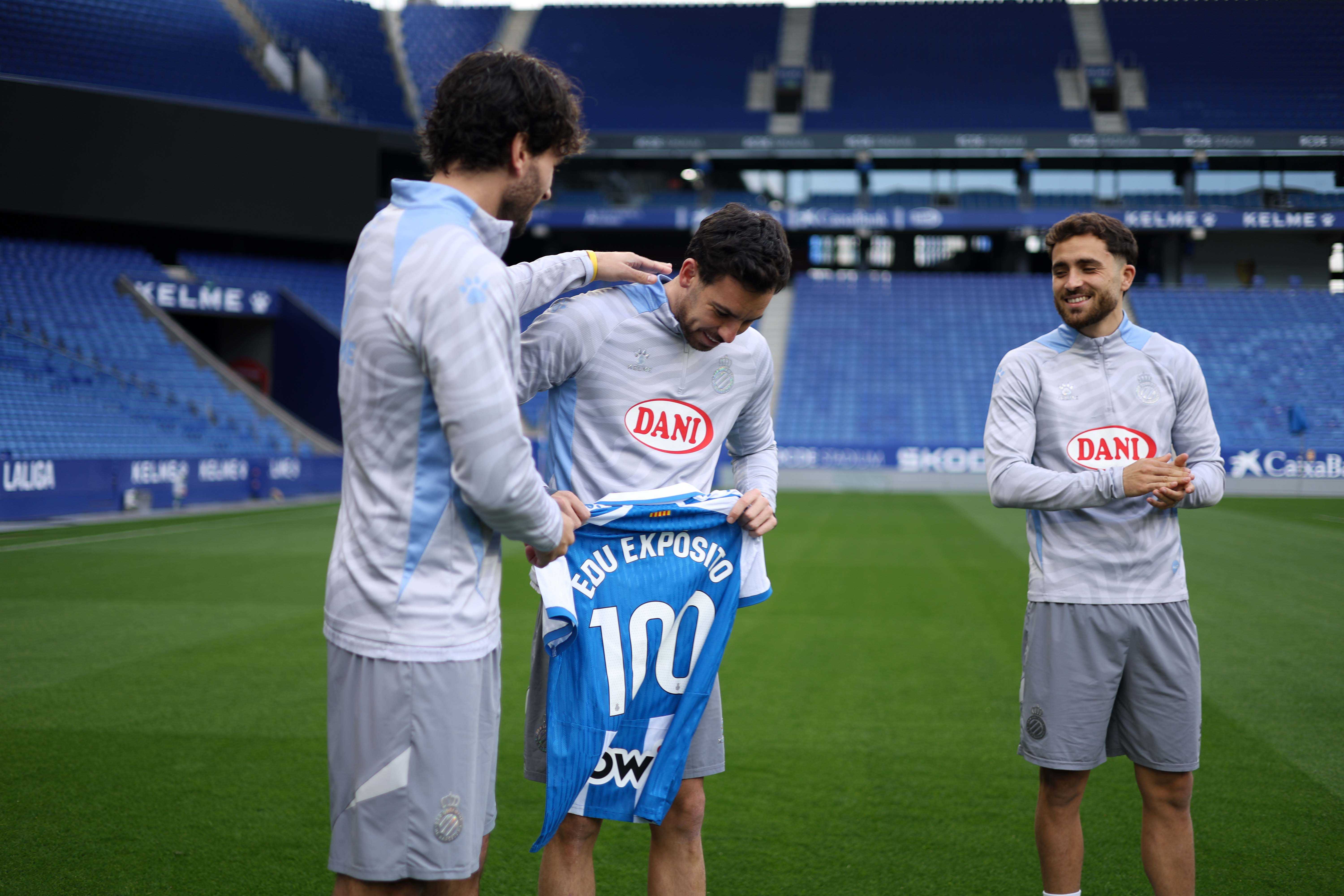 Edu Expósito rep la samarreta commemorativa pels seus 100 partits oficials amb el RCD Espanyol