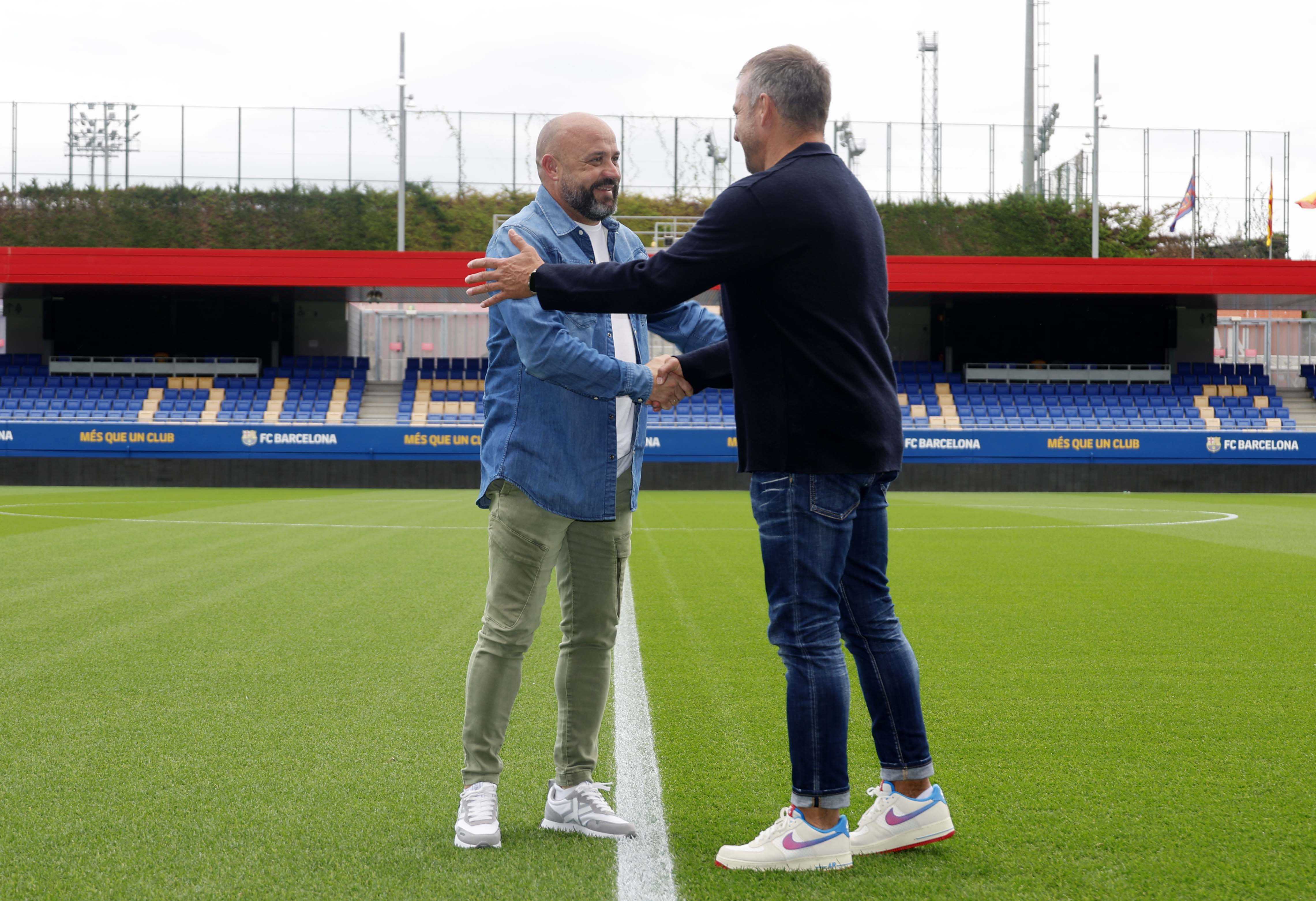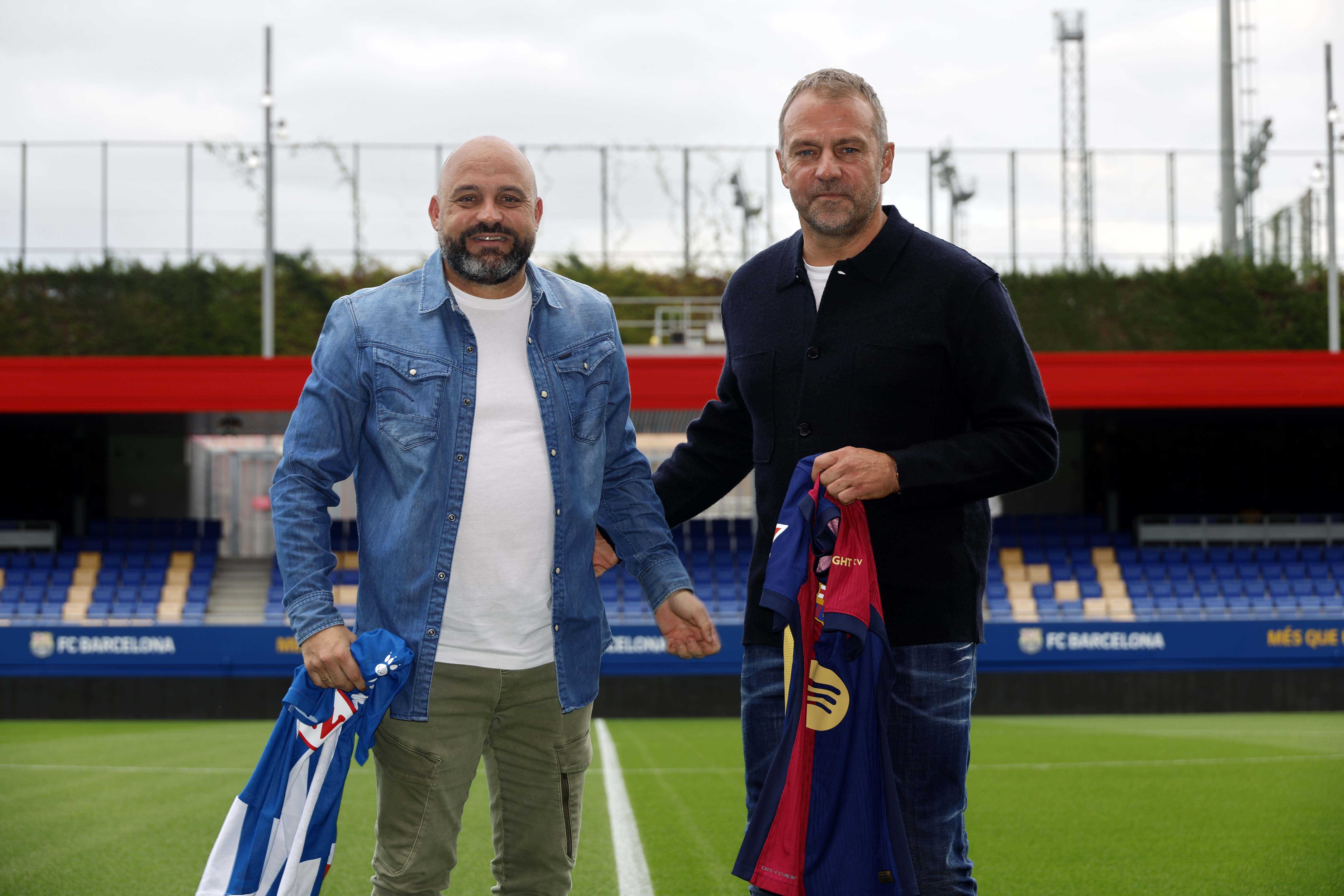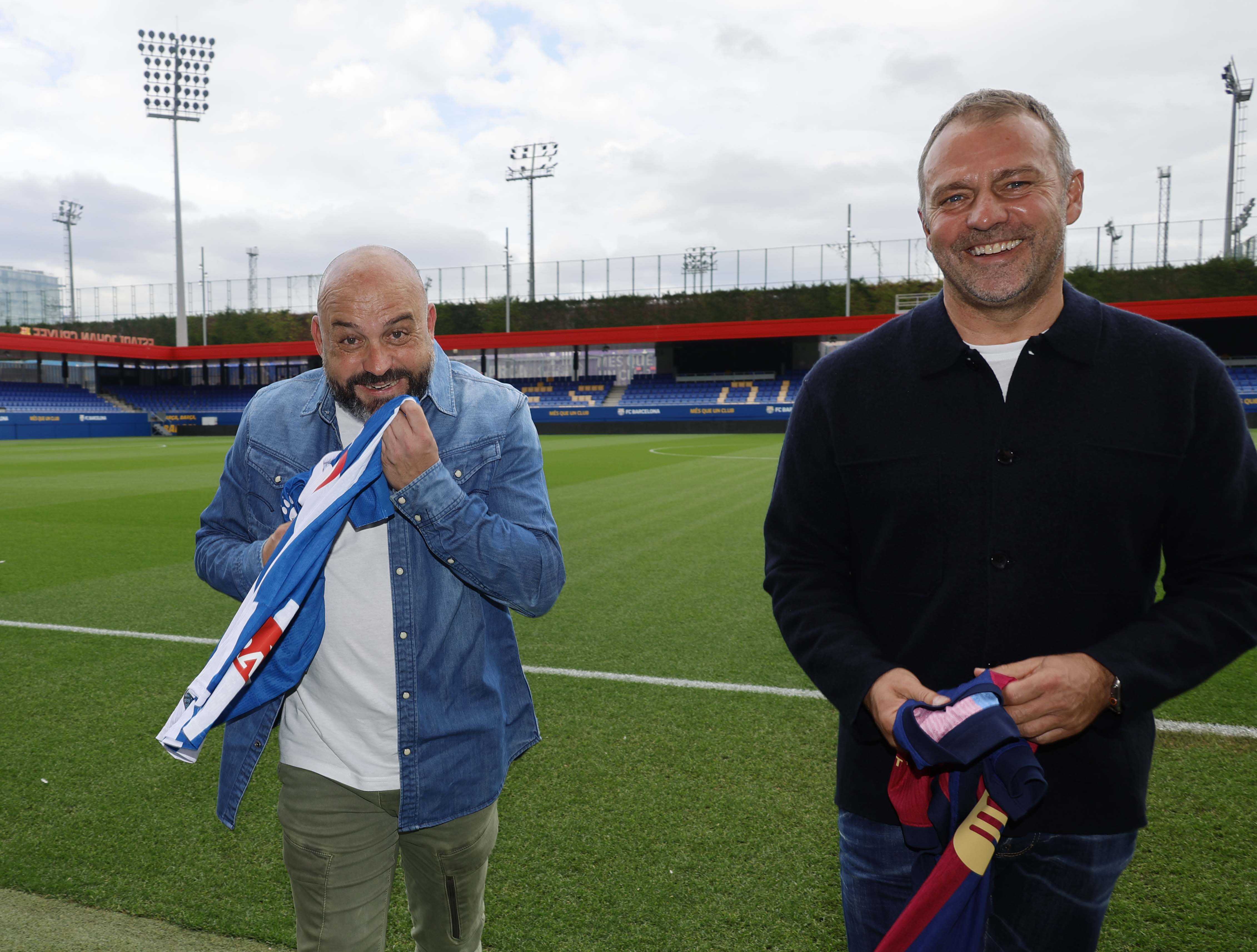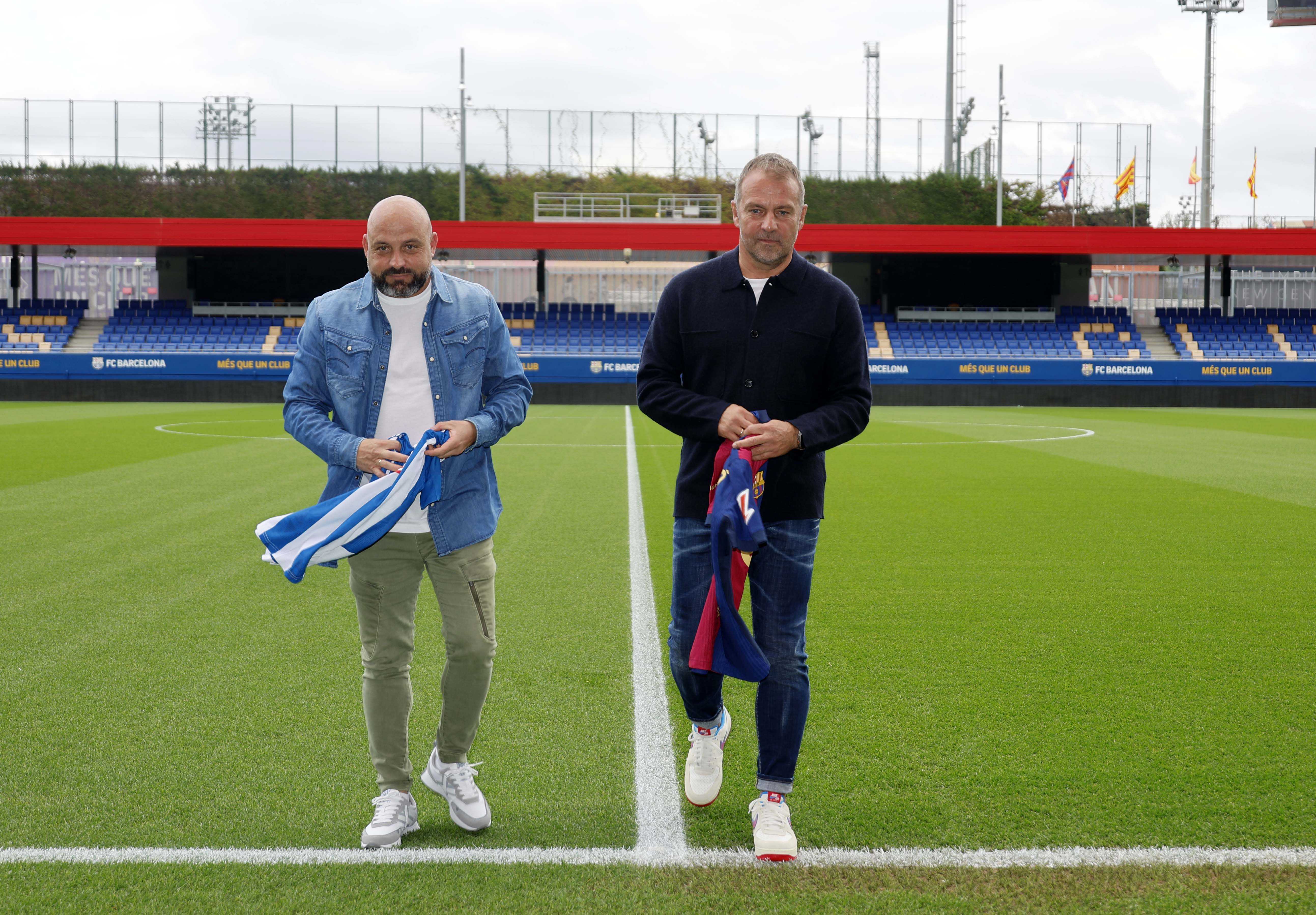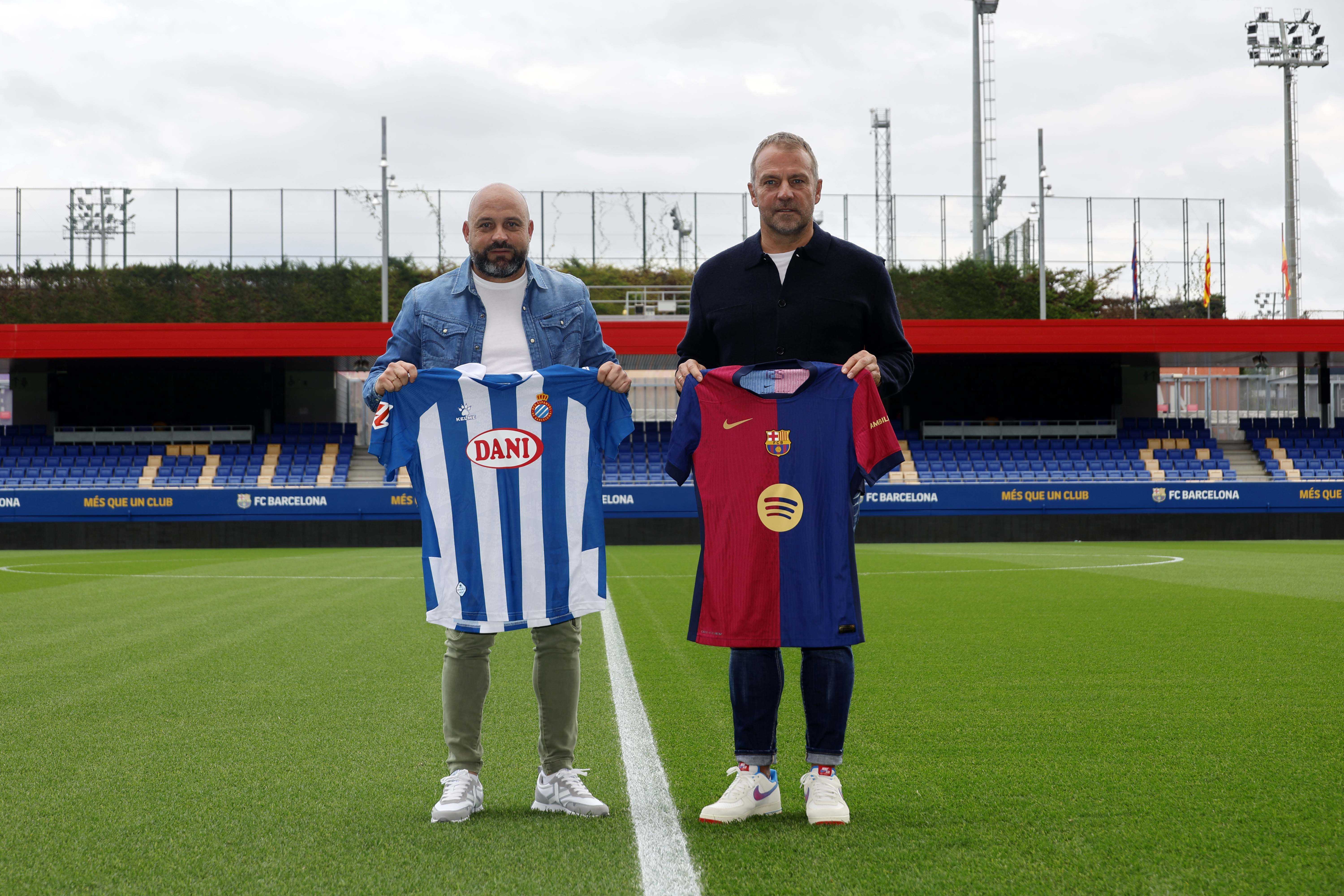 Els entrenadors del RCD Espanyol i el FC Barcelona, Manolo González i Hansi Flick, han complert la tradició abans del que serà el primer derbi per als dos tècnics. Flick, que ha exercit d'amfitrió, i Manolo González, s'han trobat a la Ciutat Esportiva Joan Gamper per fer el clàssic posat amb les samarretes dels dos equips.
