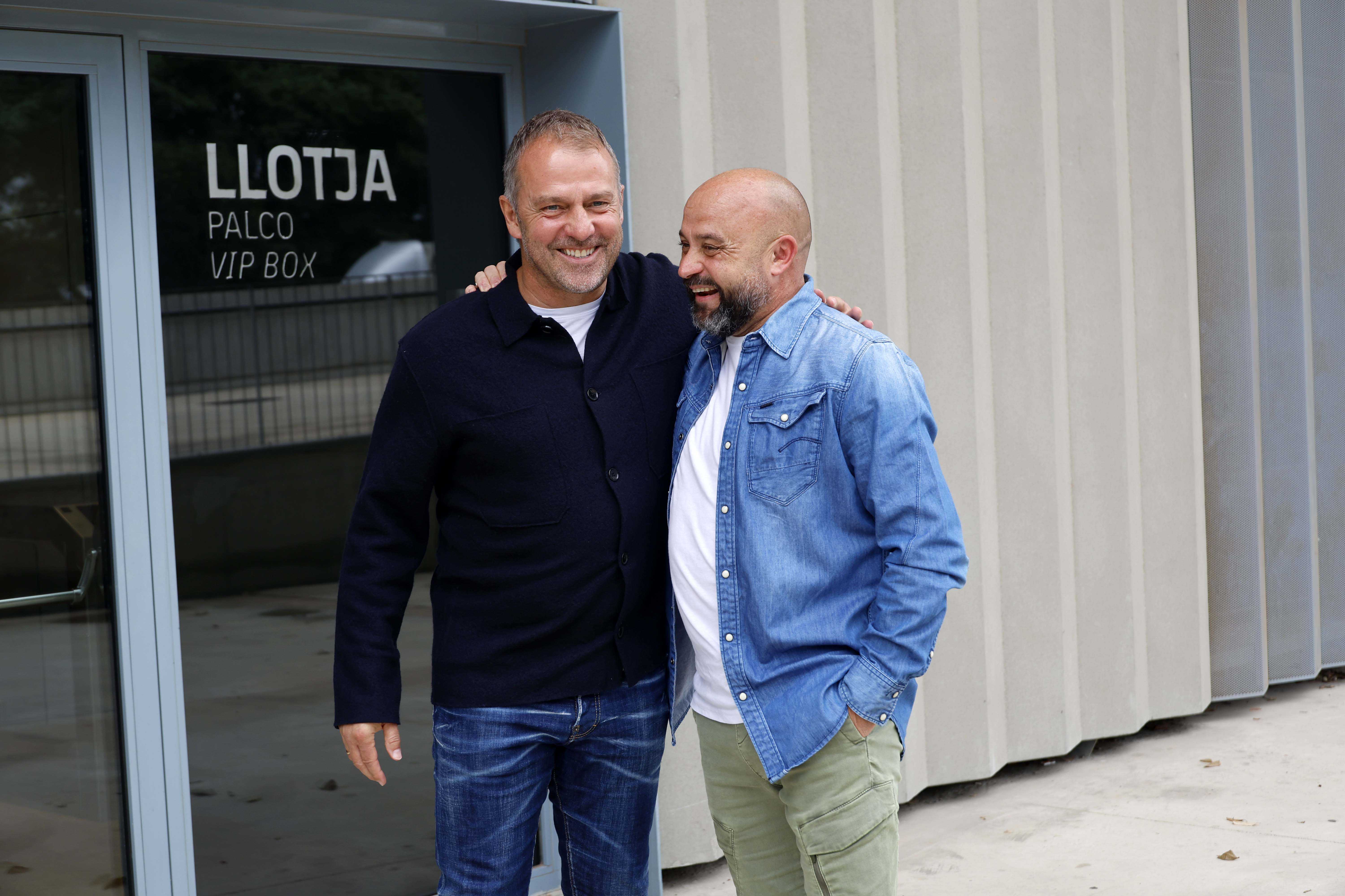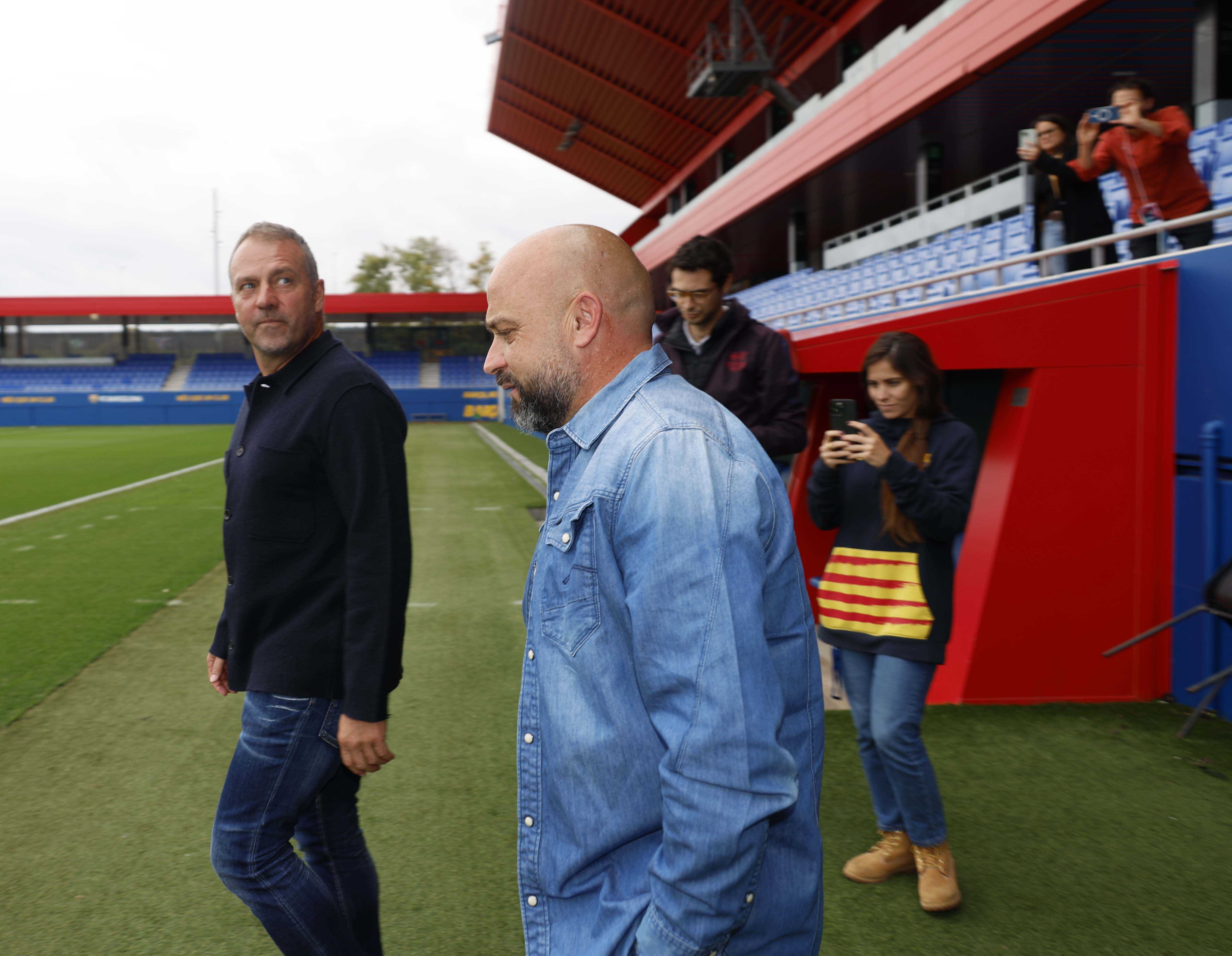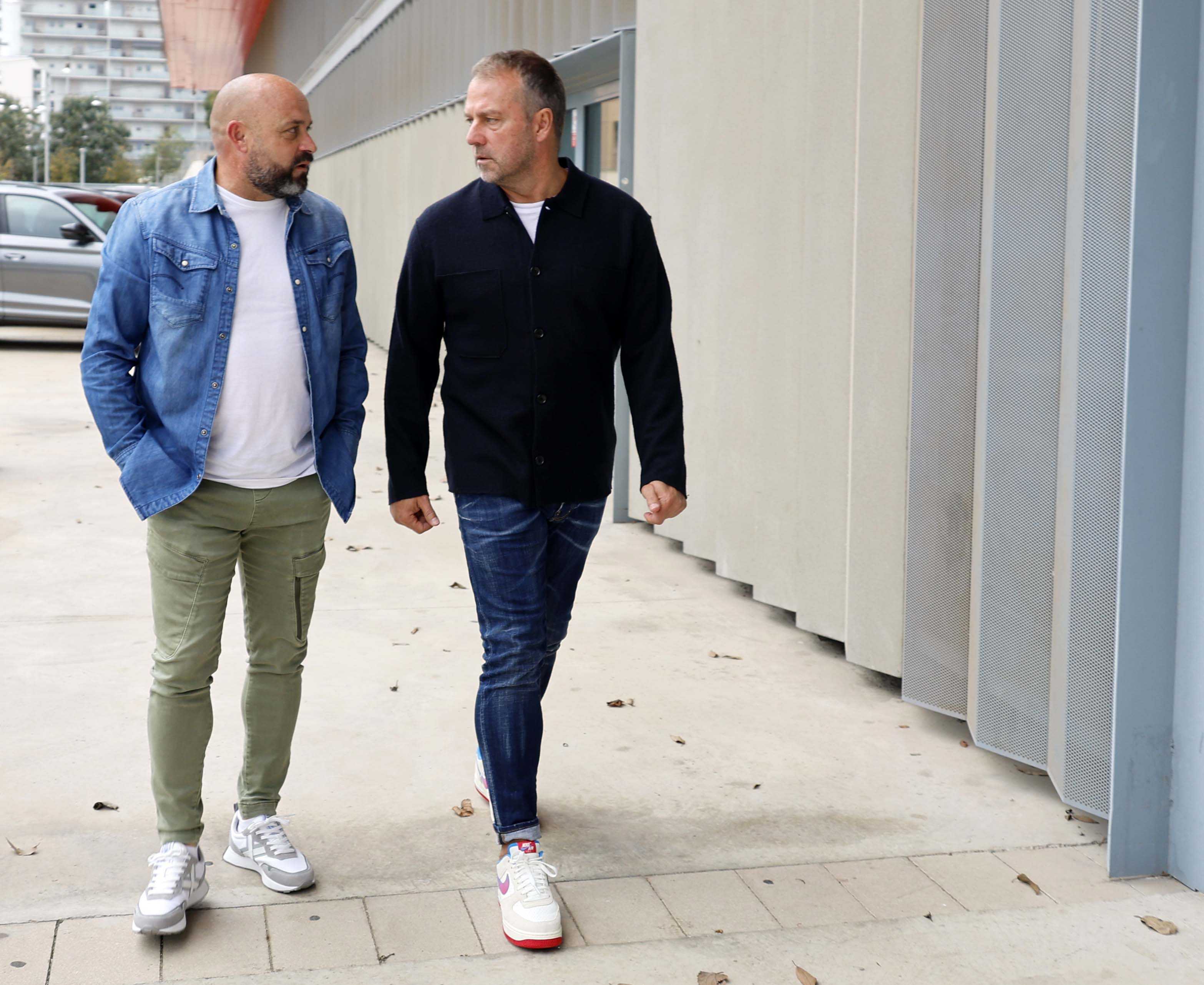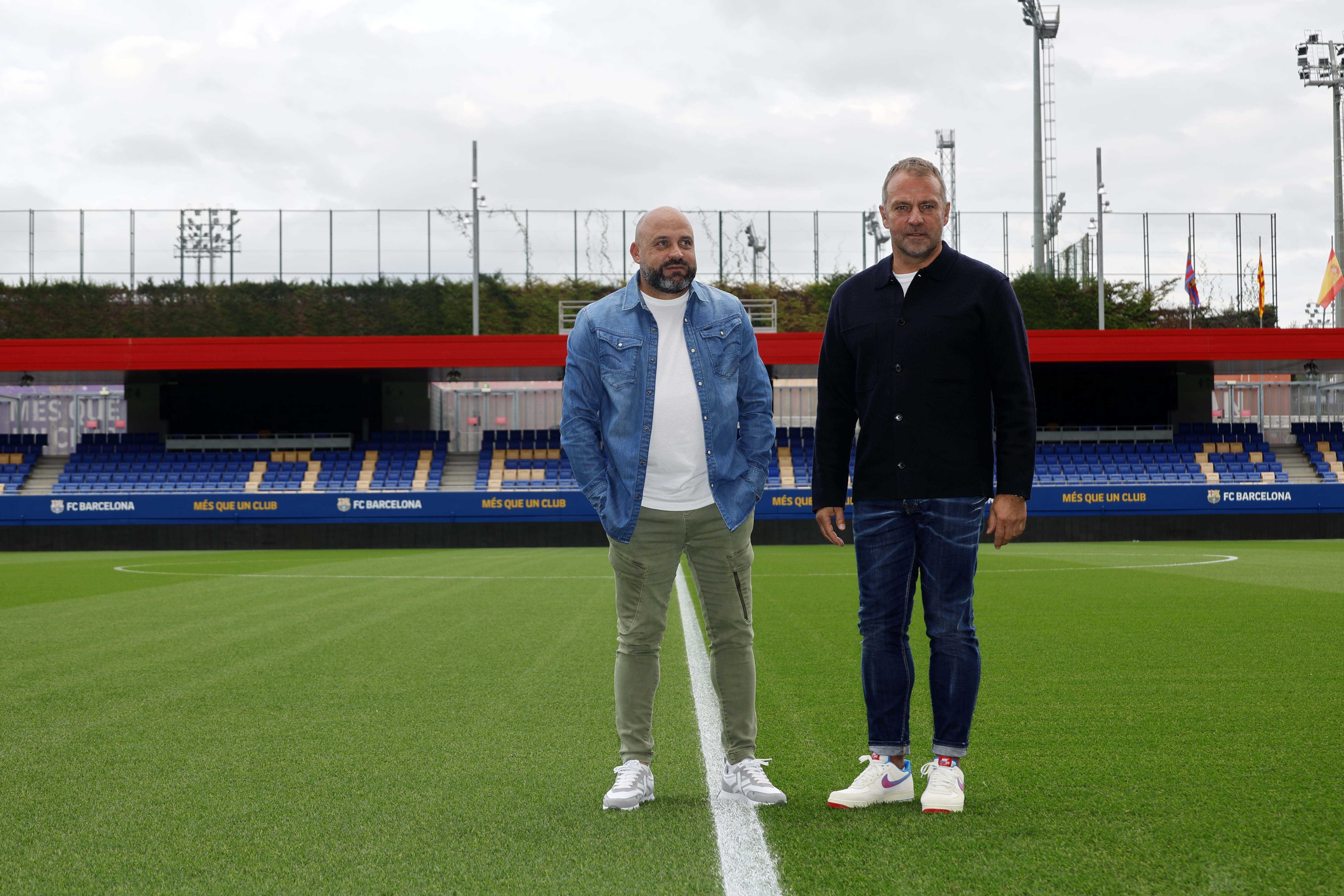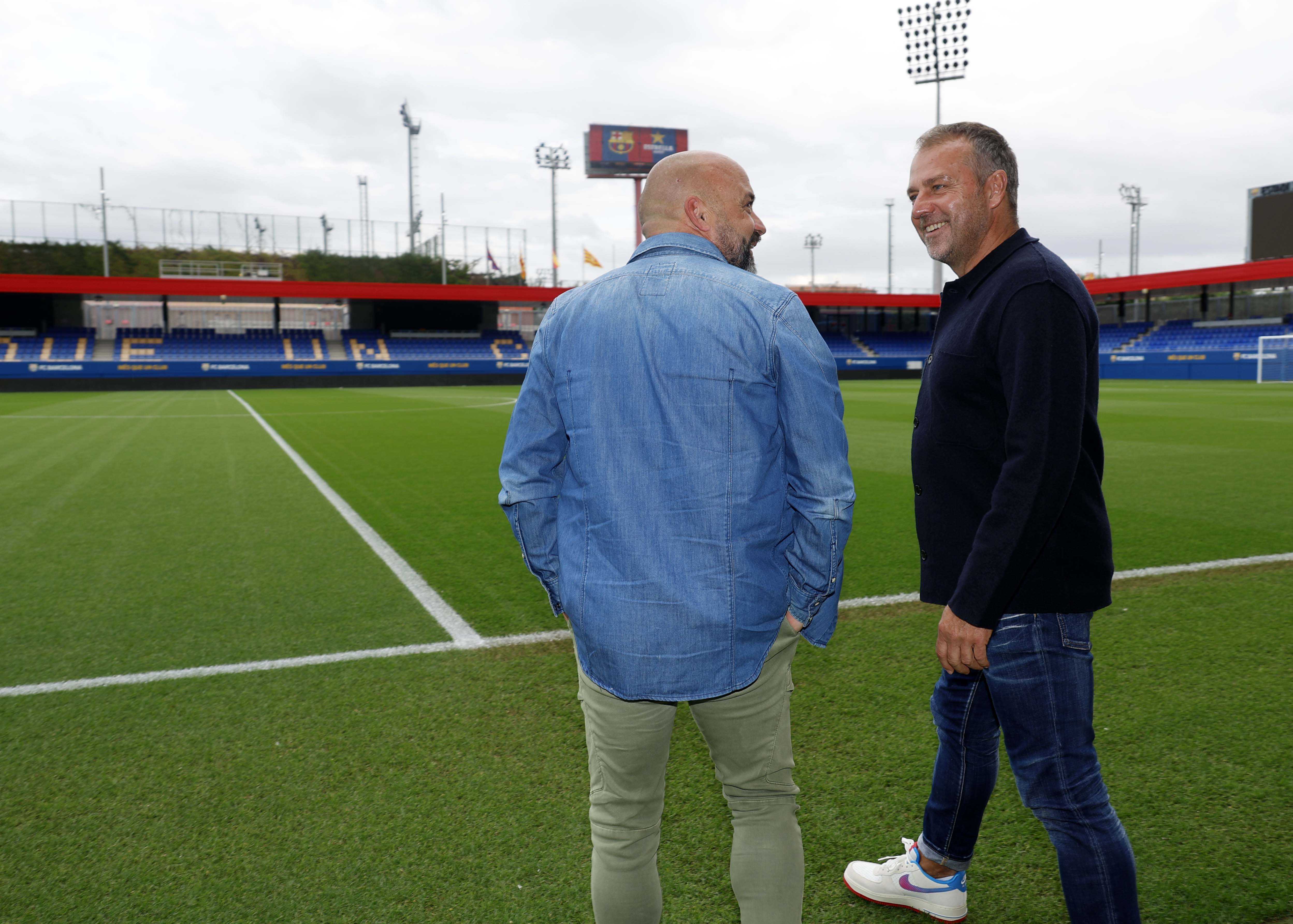 Els entrenadors del RCD Espanyol i el FC Barcelona, Manolo González i Hansi Flick, han complert la tradició abans del que serà el primer derbi per als dos tècnics. Flick, que ha exercit d'amfitrió, i Manolo González, s'han trobat a la Ciutat Esportiva Joan Gamper per fer el clàssic posat amb les samarretes dels dos equips.