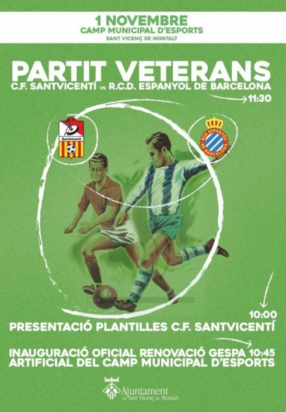 El passat dijous 1 de novembre va tenir lloc la inauguració oficial de la renovació de la gespa artificial del camp municipal d'esports de Sant Vicenç de Montalt, festa a la qual va acudir l'equip dels Veterans del RCD Espanyol que va jugar un partit davant el CF Santvicentí .