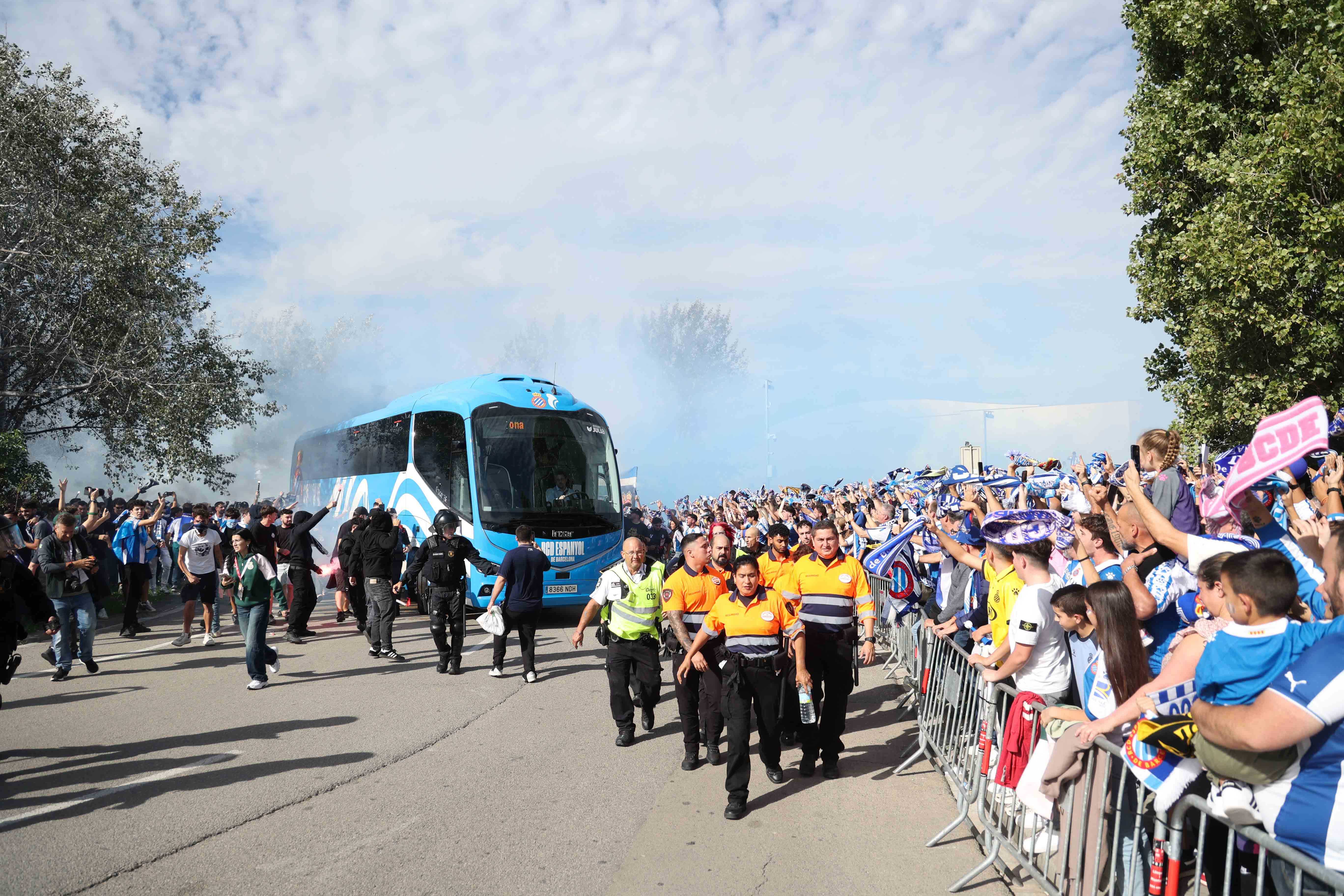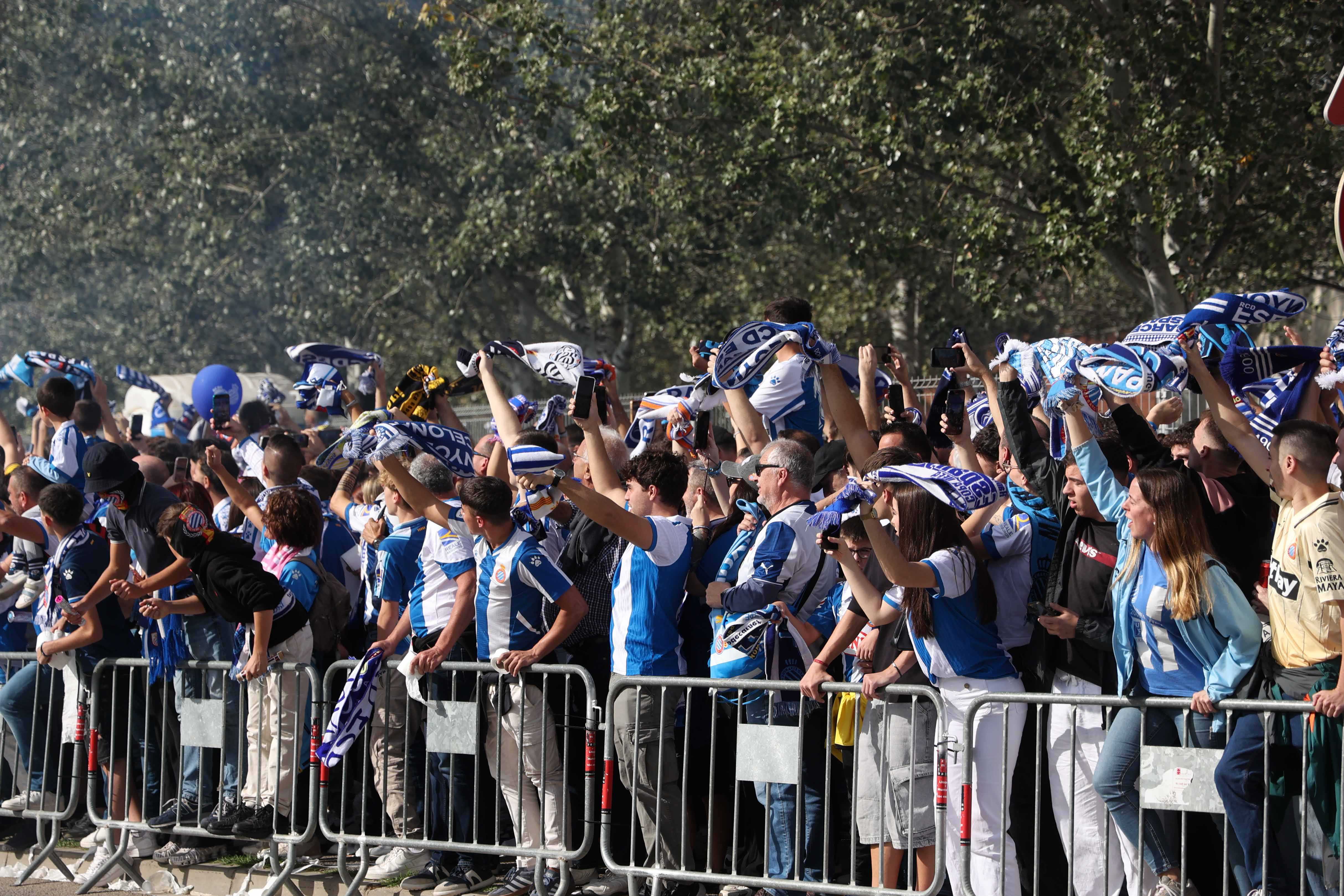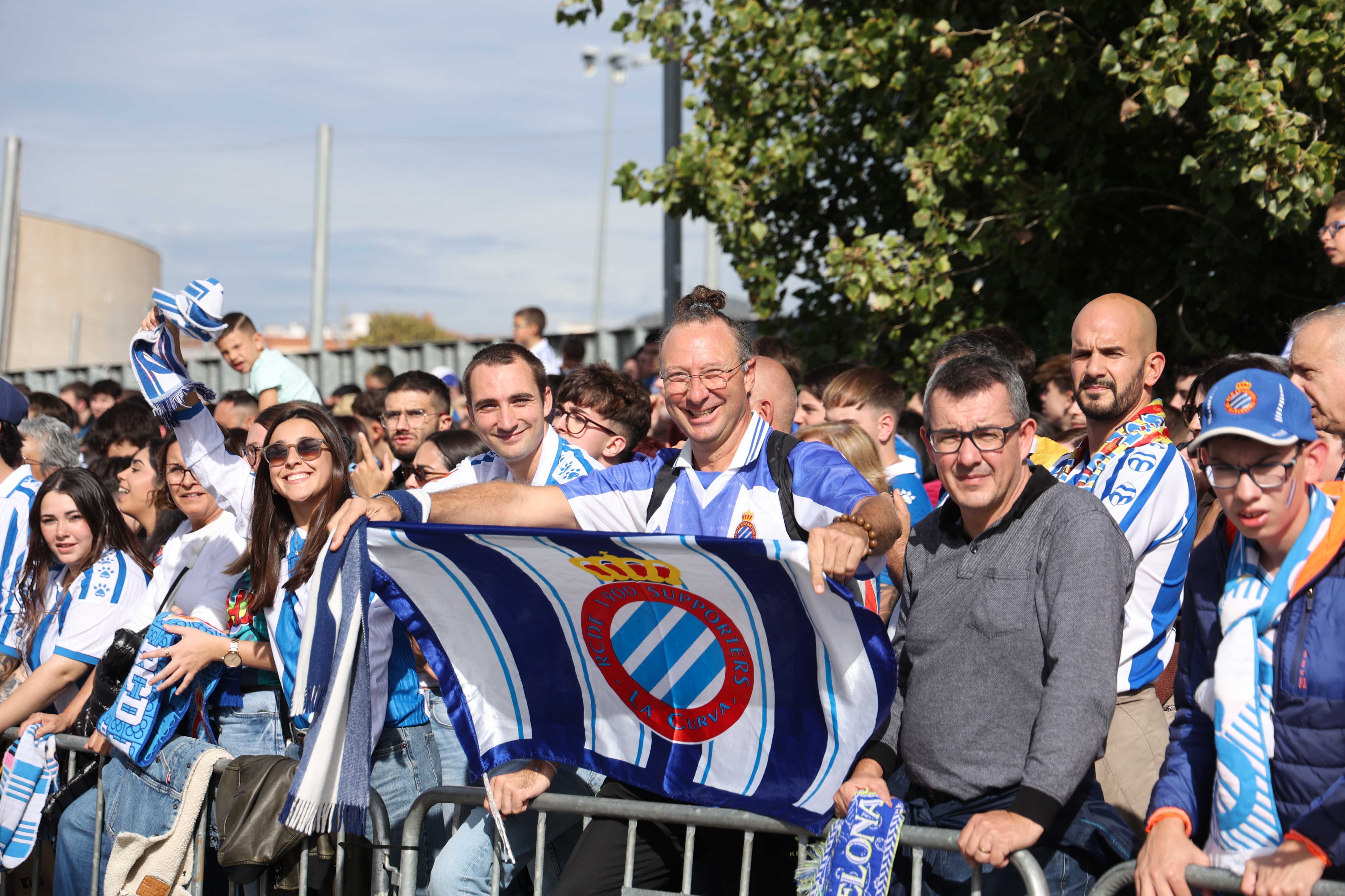 La rebuda a l’equip va ser, un cop més, espectacular. L’afició va acompanyar l’autocar del primer equip a la seva arribada al RCDE Stadium, creant una atmosfera única de passió blanc-i-blava.