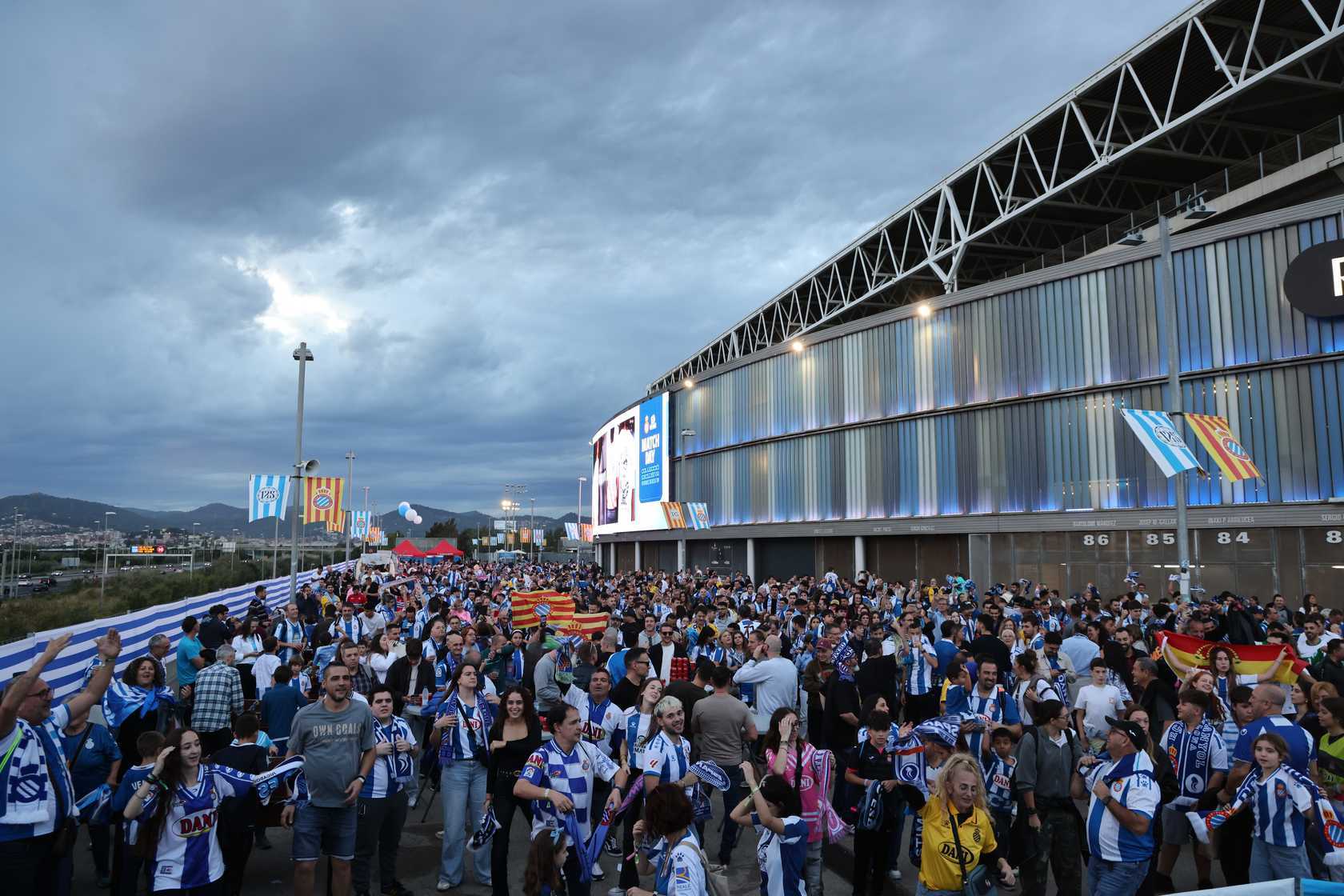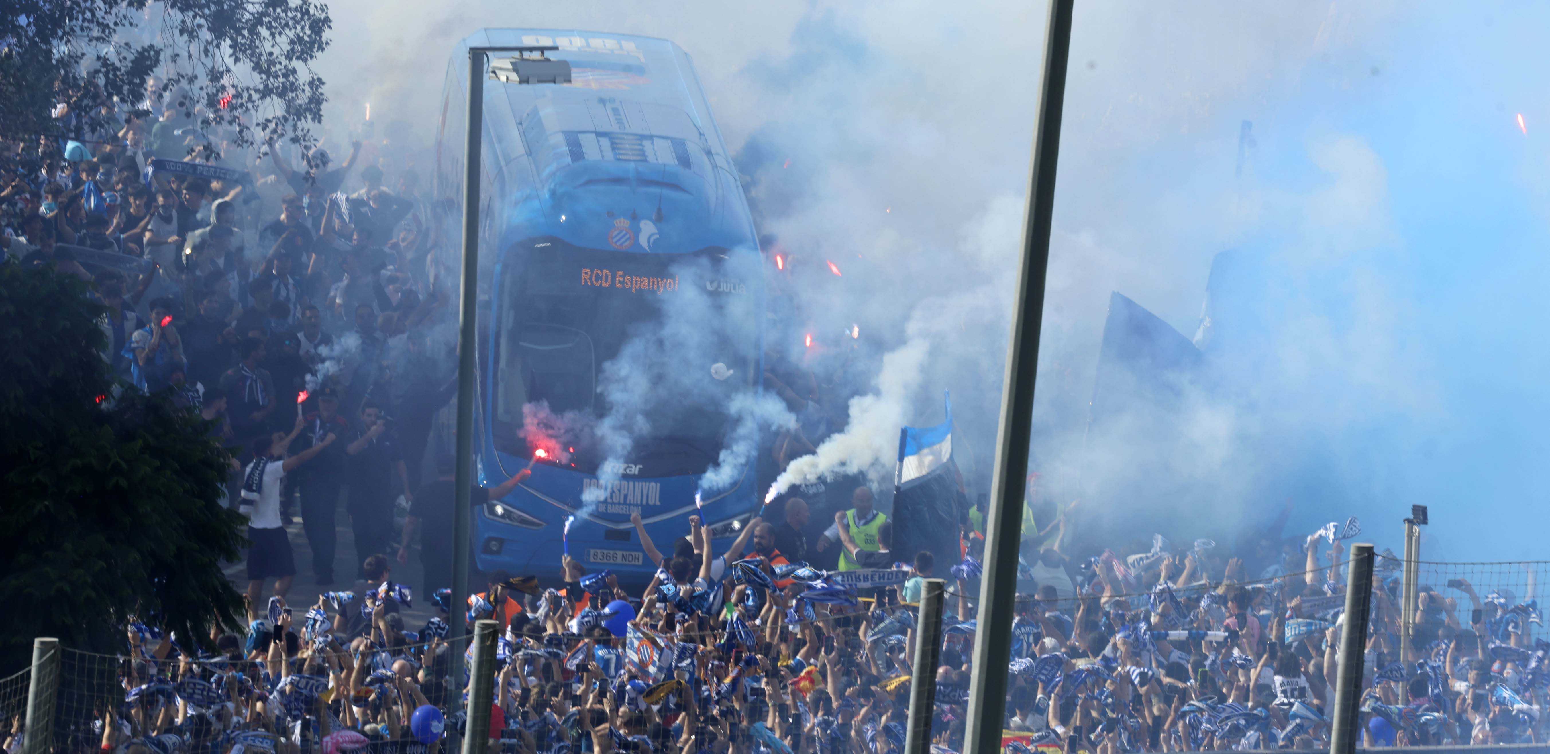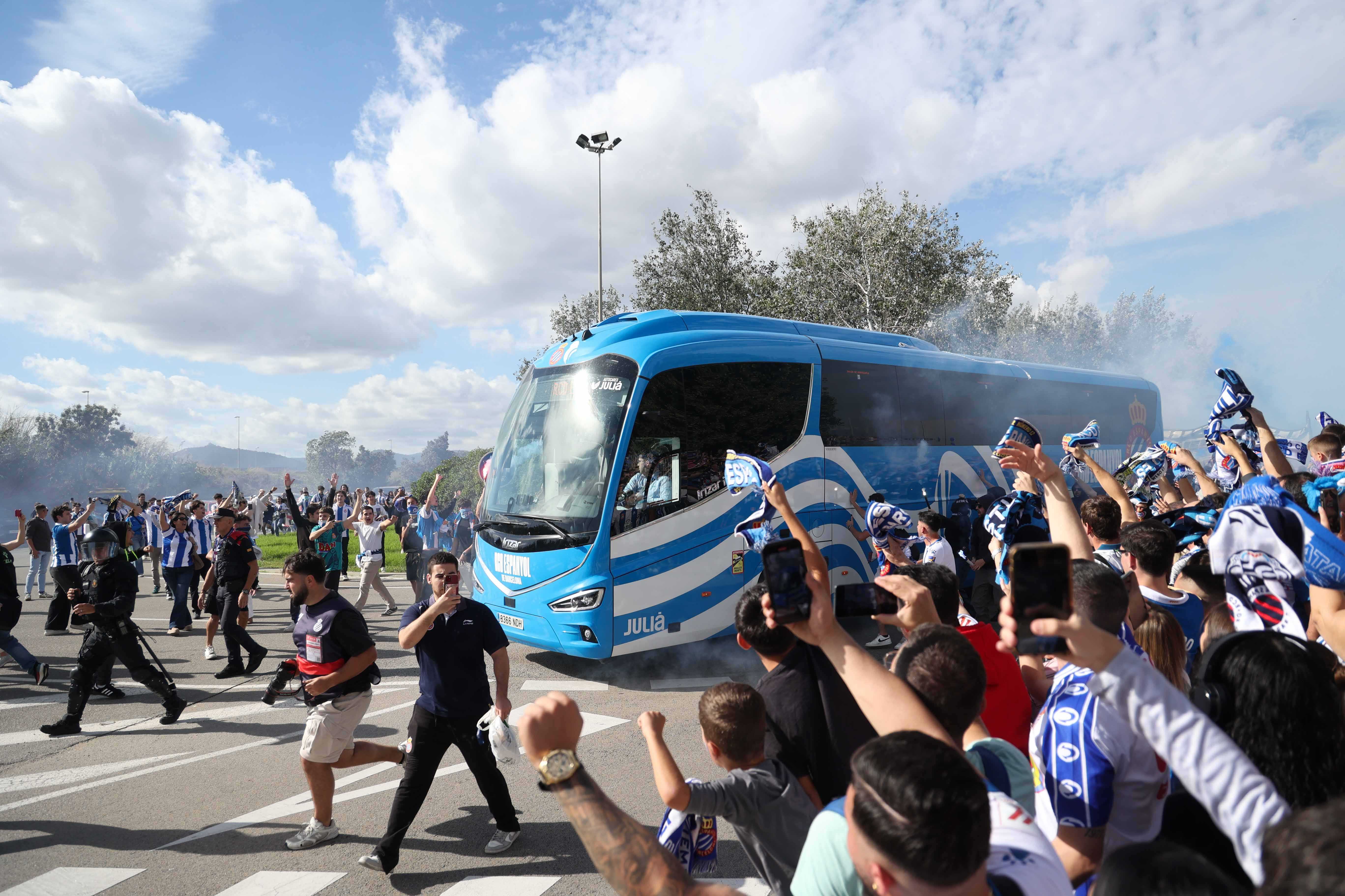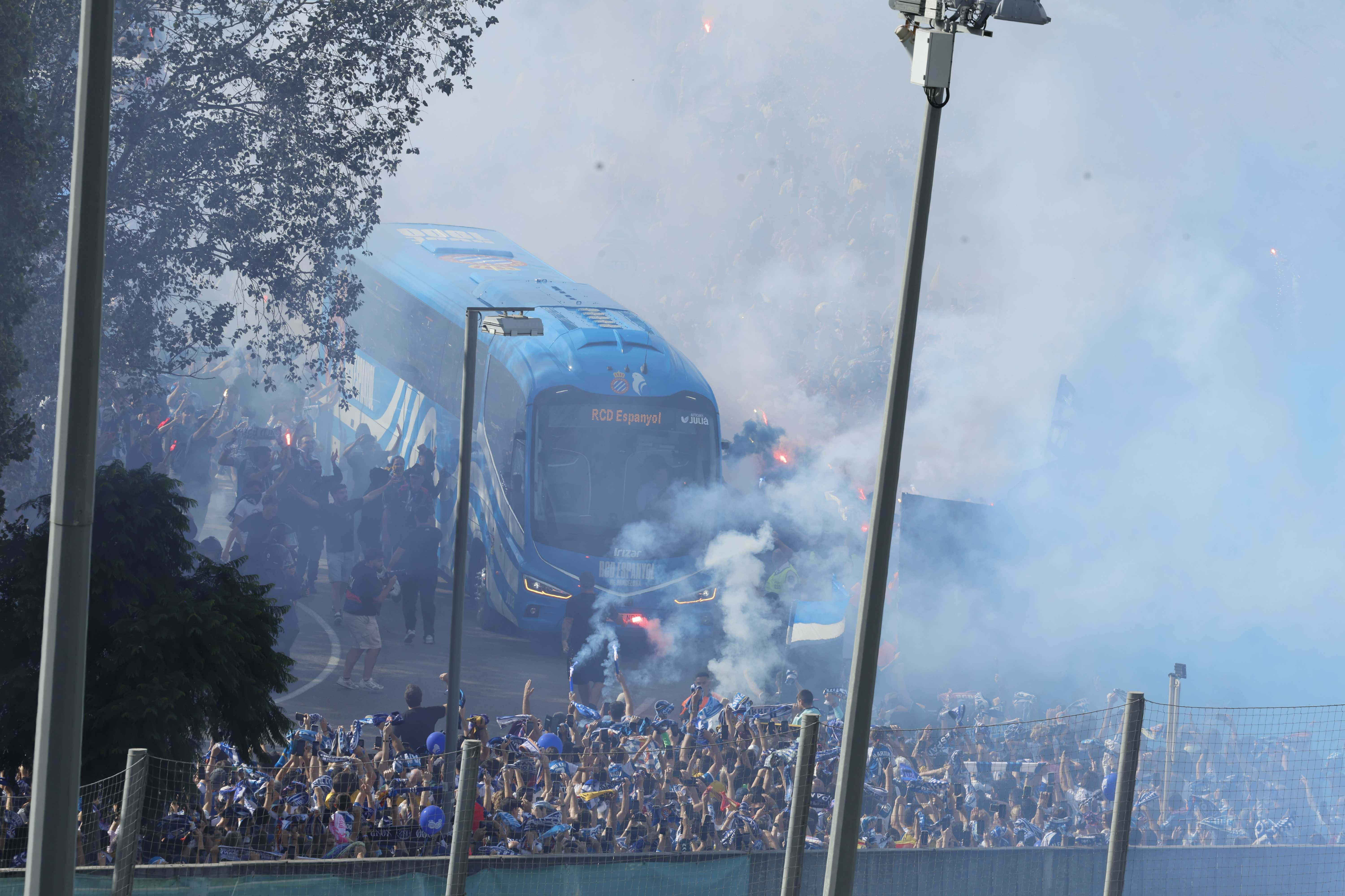 La rebuda a l’equip va ser, un cop més, espectacular. L’afició va acompanyar l’autocar del primer equip a la seva arribada al RCDE Stadium, creant una atmosfera única de passió blanc-i-blava.