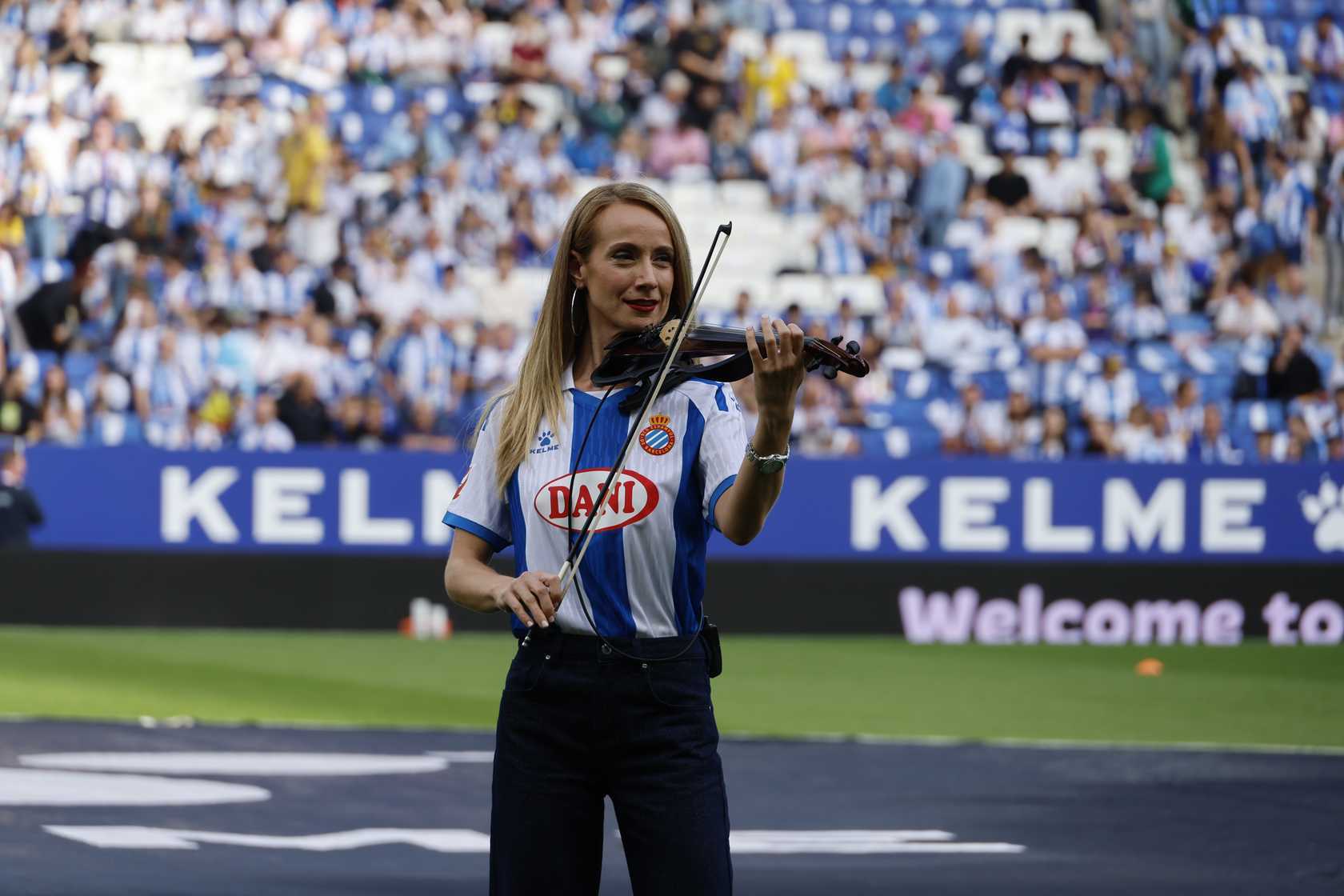 Ja a l’estadi, la violinista Noémi Jakob va posar la nota musical amb una emotiva interpretació de Será porque te amo i Sweet Caroline, mentre que Cris Juanico va emocionar el públic amb la seva versió del tema Amor Indestructible. La pirotècnia, el mosaic blanc-i-blau i el tifo recordant els orígens del club van completar un inici de partit ple de sentiment i orgull espanyolista.