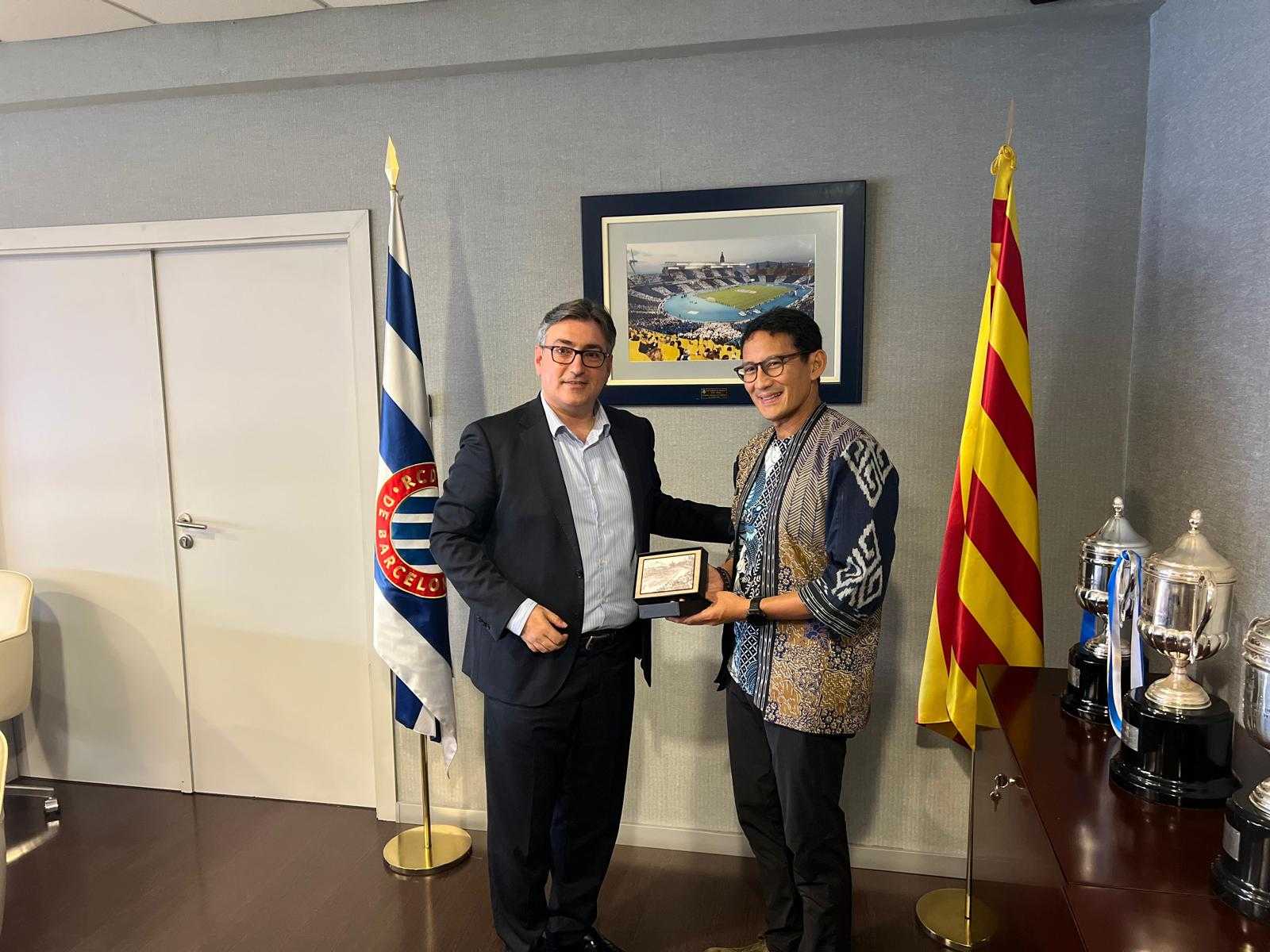 El RCD Espanyol ha rebut la visita del ministre de Turisme i Economia Creativa de la República d'Indonèsia, Sandiaga Salahudin Uno, que ha esta rebut pel subdirector general del club, Toni Alegre, a l'Stage Front Stadium.