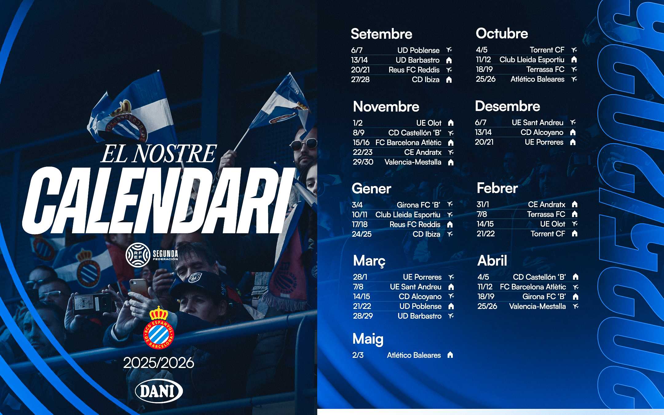 Ja coneixem el calendari complet de l'Espanyol B per a la temporada que ve. El filial perico competirà al Grup 3 de la 2a RFEF i debutarà contra el recent ascendit UD Poblense, al Municipal de Sa Pobla, a l'illa de Mallorca.