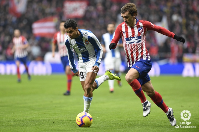 El Atleti salió acelerado. Quería acabar por la vía rápida. Marcar y manejar la ventaja. Se siente cómodo así. Cuantos menos líos, mejor. Sin embargo, los blanquiazules aguantaron sin problema los primeros minutos de presión local y poco a poco fueron acercándose cada vez con más peligro a la meta de Oblak. El primer aviso lo dio Granero, con un toque sutil que buscó la escuadra derecha del meta rojiblanco. Apenas un par de minutos después, Borja Iglesias inició una galopada al lado de los dos centrales y trató de superar a Oblak también por arriba desde fuera del área. Paradón del meta. Una segunda tuvo Borja, esta vez dentro del área, pero su remate forzado lo volvió a detener el rojiblanco. No se llevaba ni media hora de juego y los blanquiazules ya se habían acercado con peligro a la portería local en, al menos, tres ocasiones. Y luego una doble, de Baptistao, con (otro más) paradón de Oblak. El rechace le llegó de nuevo al delantero del Espanyol y su segundo intento se estrelló en el poste.