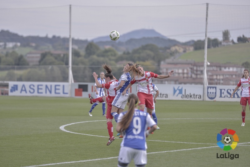 Después de unos minutos para digerir el golpe, las blanquiazules volvieron a disputar el balón en las vascas en una intensa lucha en el centro del campo para gobernar el partido. A la media hora una serie de servicios de esquina y los disparos de Lombi, Garrote y Baudet llevaron peligro a la portería de la Real pero el 1-0 se mantuvo intacto el descanso.