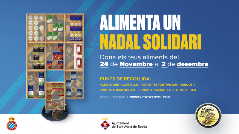 El RCD Espanyol llevará a cabo, del 24 de noviembre al 2 de diciembre, una acción solidaria que implicara a todos los estamentos del club para cubrir las necesidades básicas de algunas familias de Sant Adrià del Besòs con pocos recursos