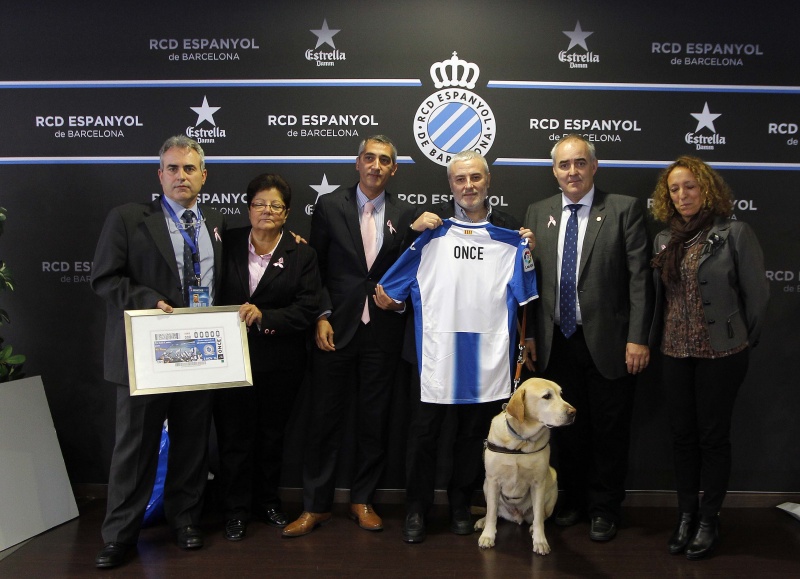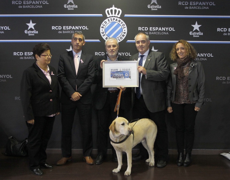 La colaboración entre la ONCE, la Federació Catalana de Penyes del Espanyol (FCPE) y el RCD Espanyol continúa estrechándose. Coincidiendo con el partido ante la SD Eibar se ha realizado un intercambio de regalos entre los asistentes. El delegado de la ONCE en Cayalunya, Xavier Grau, le ha entregado al presidente de la FCPE, Alfred Puig, un cuadro con el cupón conmemorativo del 25 aniversario de la Federació. Grau, por su parte, ha recibido una estatua de la afición y una camiseta del consejero delegado, Ramon Robert. Al finalizar la entrega, foto para el recuerdo. Además cuatro vendedores de cupones han tenido acceso al estadio para vender sus cupones.