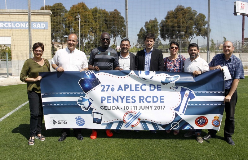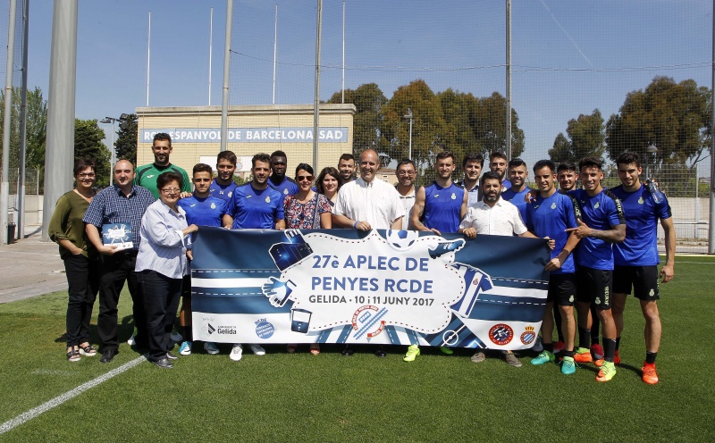 Los organizadores del 27º Aplec de Penyes del RCD Espanyol, que se celebrará en Gelida los próximos 10 y 11 de junio, ultiman los últimos detalles. El presidente de la Penya Blanc i Blava de Gelida, Juanjo Tavira, varios integrantes de su junta directiva, la presidenta de la Federació Catalana de Penyes del Espanyol (FCPE), Araceli Pérez, y el alcalde de Gelida, Lluís Valls, se han acercado a la Ciudad Deportiva Dani Jarque para presentar los actos de este gran acontecimiento perico que ha contado, una vez más, con el apoyo del cuerpo técnico y de los jugadores del primer equipo.